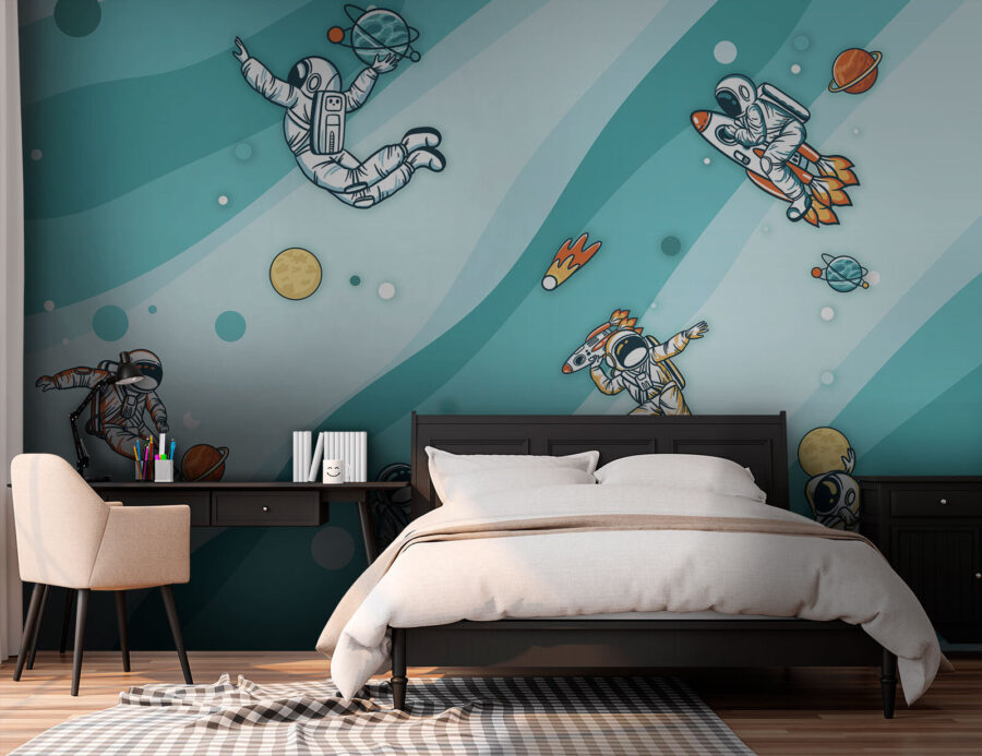 Transforma una pared lisa en un parque infantil interestelar con este encantador mural que muestra a un animado grupo de astronautas flotando en el espacio. Cada vez que alguien pase por delante, sentirá que se ha topado con una aventura cósmica, con planetas ilustrados a todo color, divertidas estelas de cometas y un montón de travesuras en gravedad cero. Imagina a un niño señalando alegremente el mural y diciendo que ha encontrado un nuevo amigo espacial, o a un adulto riéndose al ver a un astronauta dando una patada a un planeta como si fuera un entrenamiento de fútbol. El relajante fondo en acuarela añade un toque de ensueño, lo que lo hace perfecto para un dormitorio, una sala de juegos o incluso un espacio de oficina creativo. No es solo decoración, ¡es un billete para la órbita!