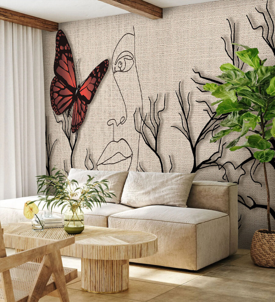 Transforma tu espacio con este impresionante mural que muestra una mariposa revoloteando cerca del rostro de una mujer, envuelta en delicadas ramas. No es solo arte, es toda una declaración de intenciones, como tener un momento de serenidad capturado en tu pared. Piensa en despertarte cada día con esta belleza: la vibrante mariposa aporta un soplo de vida, mientras que las suaves expresiones evocan una sensación de calma. Perfecto para una acogedora sala de estar o un rincón creativo, invita a la curiosidad y a la conversación. Además, ¿a quién no le gustan las mariposas? Son como pequeños artistas de la naturaleza, que añaden encanto y fantasía. ¡Disfruta de un ambiente único y personal!