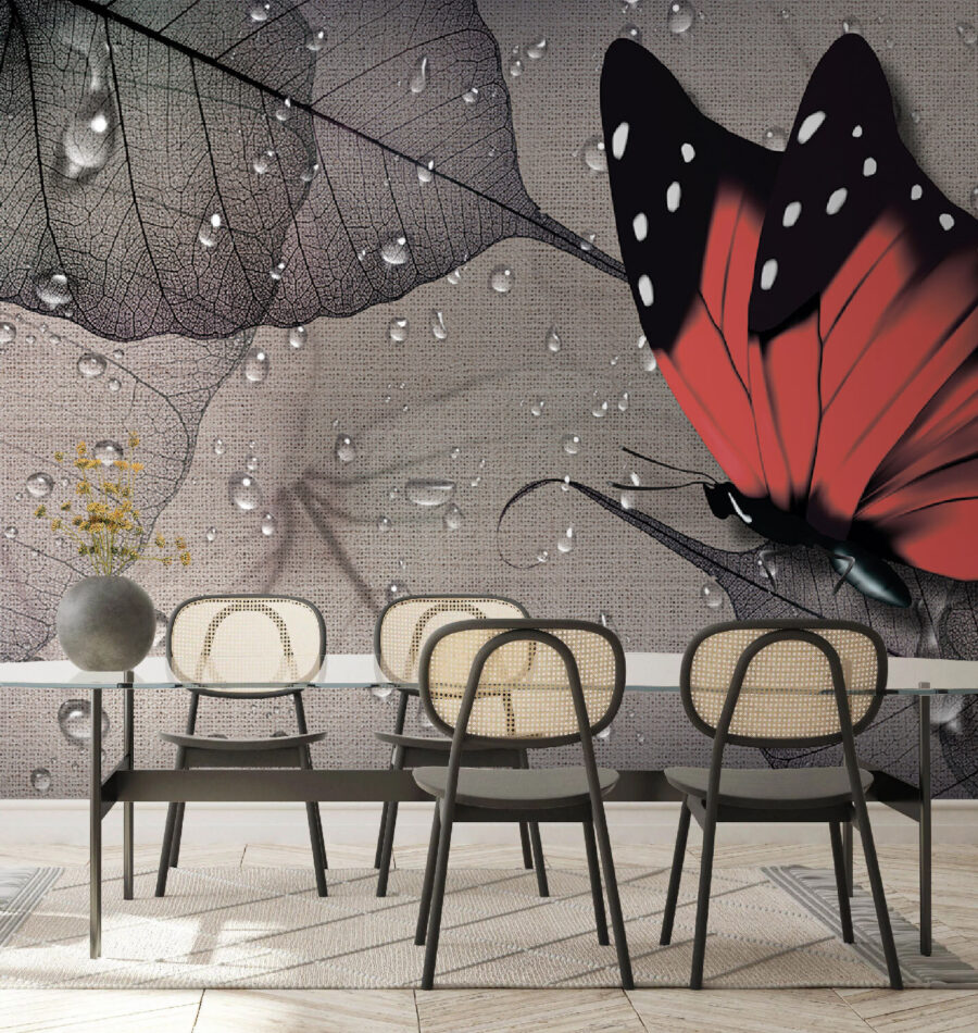 Transforma cualquier estancia en un remanso de paz con el encantador mural «Mariposa sobre una hoja». Imagínate esto: entras y, ¡bum! Hay una llamativa mariposa posada sobre una delicada hoja bañada por gotas de lluvia. Es el tipo de obra de arte que te hace detenerte, sonreír y tal vez incluso soñar despierto con revolotear por un tranquilo jardín.