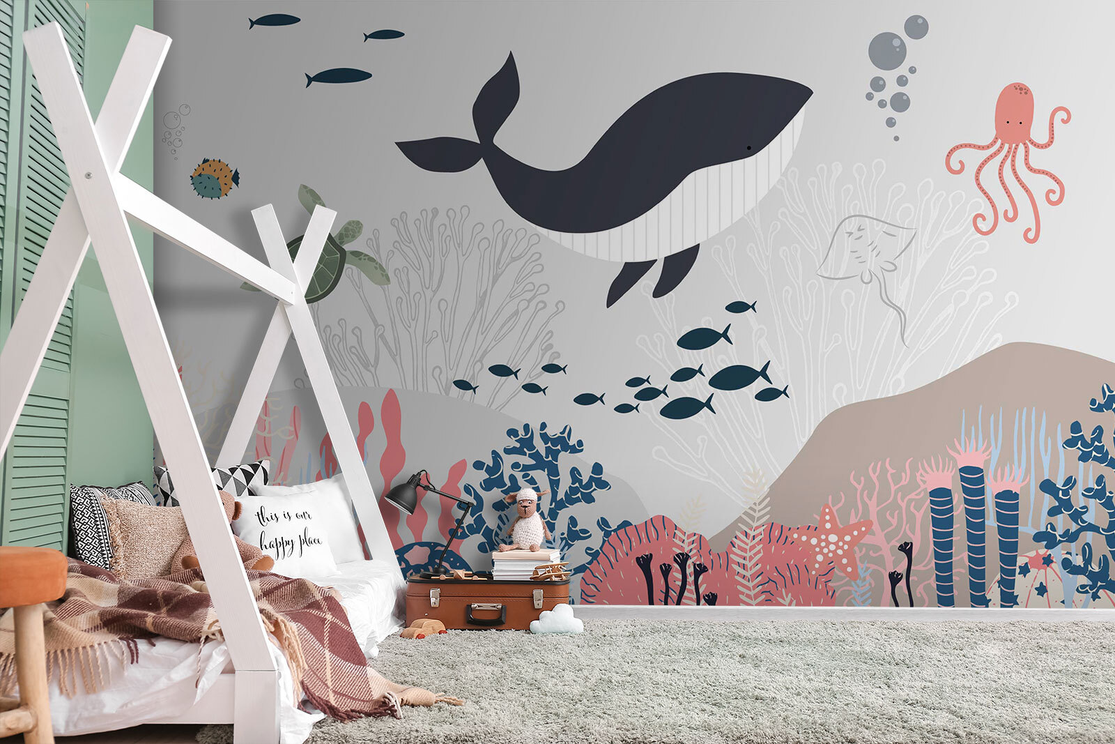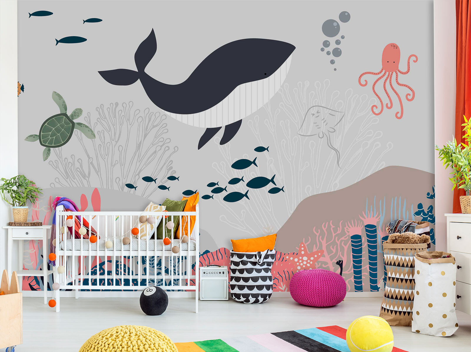 ¿Quiere añadir un toque de diversión a la habitación de su hijo? Eche un vistazo a los “Murales de pared Ballena y tortuga bajo el agua”. Este mural no es sólo para las paredes: es una aventura bajo el mar, justo en tu propia casa. Imagina una alegre ballena y una curiosa tortuga nadando juntas en un colorido mundo submarino. Es perfecto para despertar la imaginación de los más pequeños y crear historias sobre aventuras marinas antes de dormir. Además, no es demasiado recargado ni brillante, sólo una paleta suave que tranquiliza y entretiene. Imagina que a tu hijo se le iluminan los ojos cuando ve el pulpo o el banco de peces. Es como tener un acuario sin mantenimiento. Un toque encantador y caprichoso para cualquier dormitorio o cuarto de juegos. Sumérgete en este mural y deja que empiece la magia submarina.