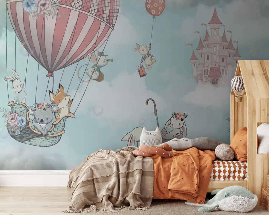 A los más pequeños les encantará ver los encantadores detalles: un koala con una corona de flores, pequeños conejitos con globos, todos flotando entre esponjosas nubes con un castillo de ensueño de fondo. Toda la escena es encantadora, como si pudieran saltar a su propio cuento de hadas nada más despertarse.