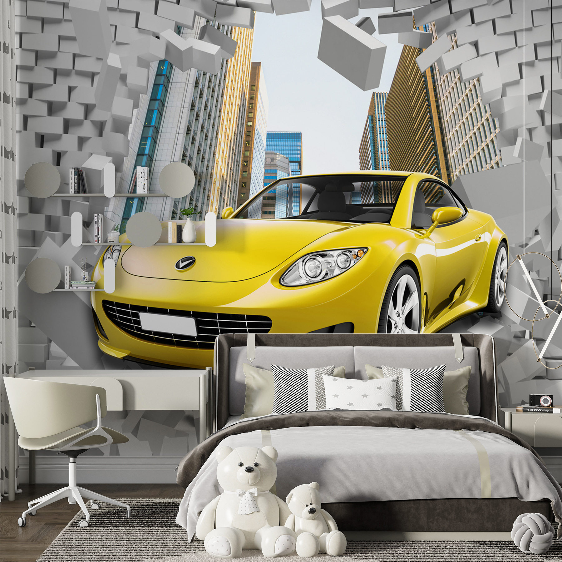 ¿Has pensado alguna vez en darle un toque de emoción a tu habitación? Imagínese un coche deportivo atravesando una pared de ladrillo justo en su pared. Este mural es perfecto si tiene un pequeño entusiasta de los coches en casa, o simplemente alguien a quien le guste un poco el dramatismo. Forma parte de las colecciones “Automóvil” y “Pared de ladrillos”, pero también es fantástico para habitaciones infantiles. La energía de los ladrillos que chocan y el elegante coche amarillo añaden un toque de color y acción. Es como añadir una dosis de adrenalina a tu decoración. En serio, ¿te imaginas la cara que pondrán tus invitados? Todo un espectáculo.