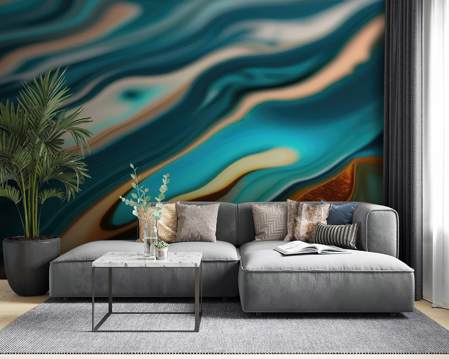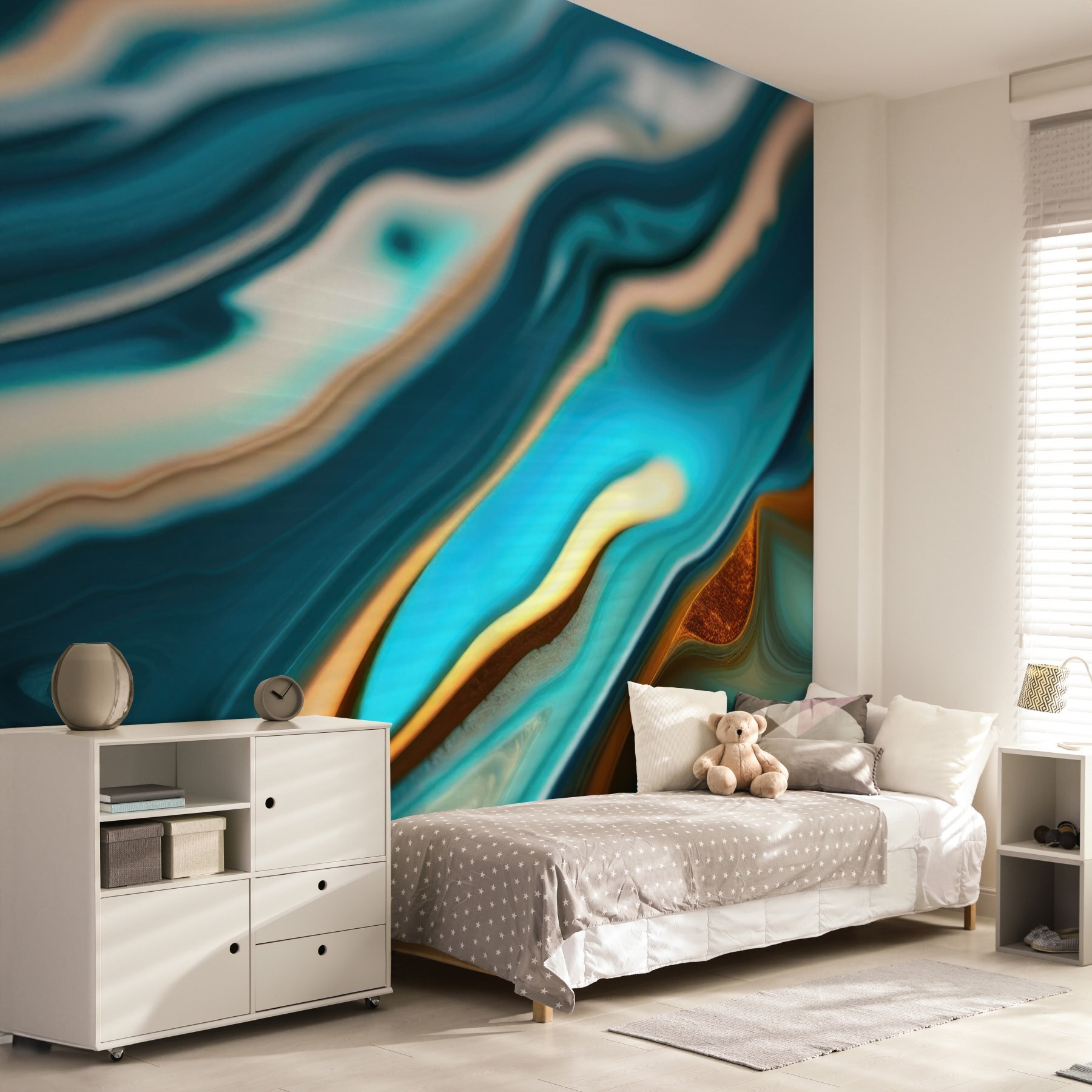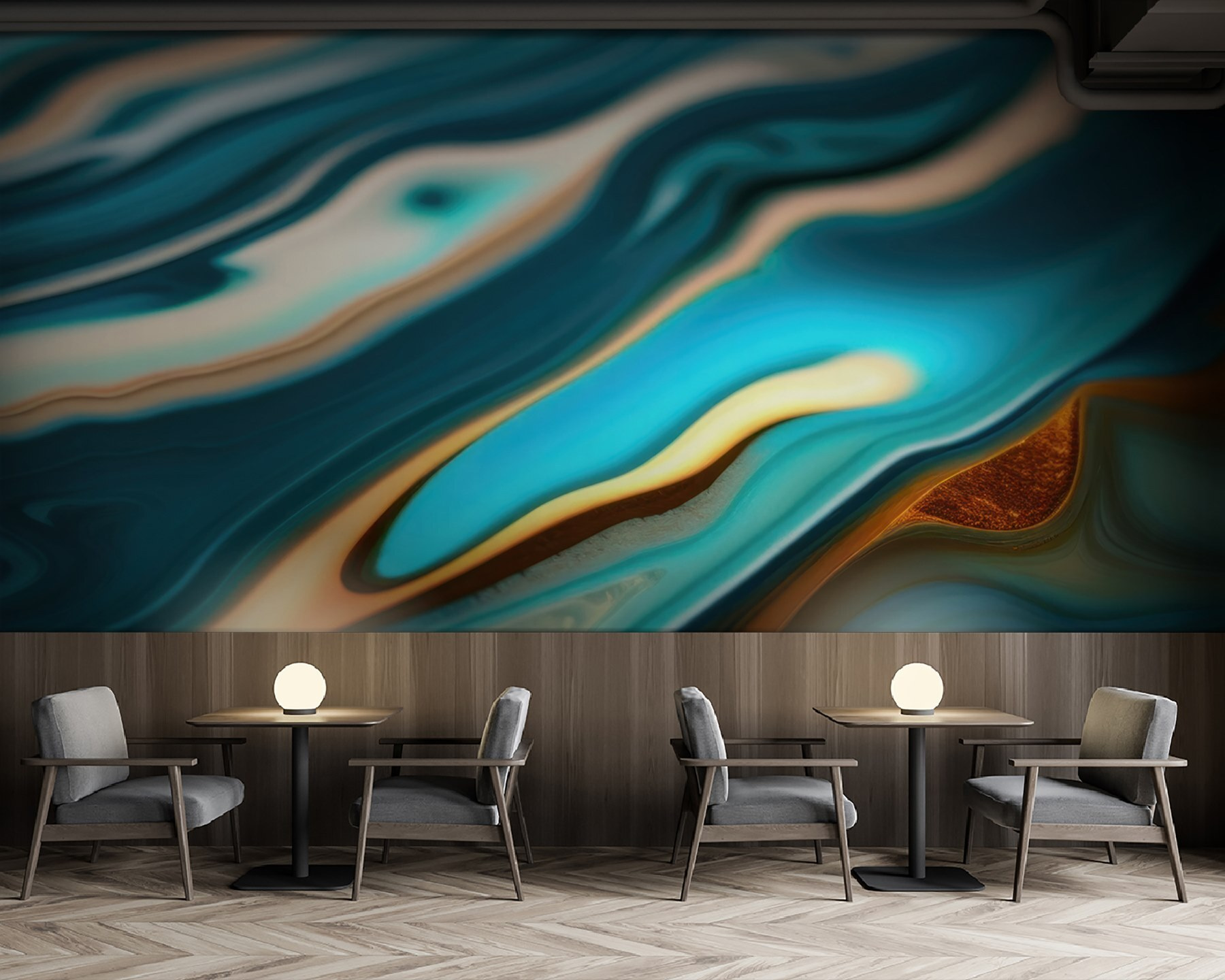 Transformar una pared para capturar colores fluidos en patrones armoniosos es como invitar a una brisa relajante a su hogar. Imagínese que se despierta, entra en su habitación y se siente como si estuviera en una escapada junto al mar, sin la arena en los zapatos. Este mural presenta una mezcla de azules y acentos cálidos que bailan juntos, creando una melodía visual que calma la mente. Es perfecto para un rincón acogedor donde tomar un café y reflexionar sobre la vida o para un espacio vital vibrante que despierte la conversación. Añada este mural y deje que cada mirada sea una minivacación.