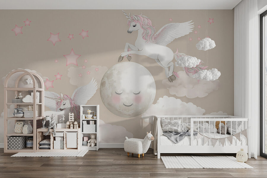 Imagínatelo: la habitación de tu hijo transformada en un caprichoso país de los sueños con este adorable mural de pared “Unicornio con alas y cuerno”. Está repleto de nubes esponjosas, estrellas centelleantes y los unicornios más bonitos y mágicos volando por ahí. El ambiente es suave, de ensueño y perfecto para despertar la imaginación de los más pequeños. Imagínate cuentos para dormir bajo la dulce mirada de estos unicornios encantados: cada noche será como un viaje a un lejano reino de cuento de hadas. Es como tener un trozo de magia en la pared, creando momentos de alegría y asombro una y otra vez.