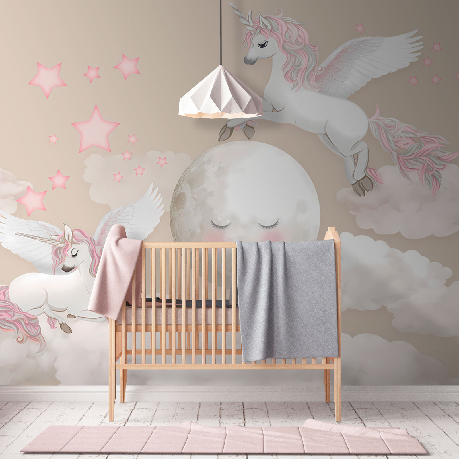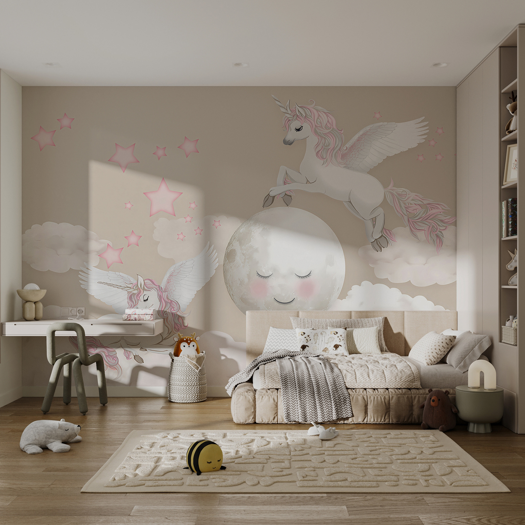 Imagínatelo: la habitación de tu hijo transformada en un caprichoso país de los sueños con este adorable mural de pared “Unicornio con alas y cuerno”. Está repleto de nubes esponjosas, estrellas centelleantes y los unicornios más bonitos y mágicos volando por ahí. El ambiente es suave, de ensueño y perfecto para despertar la imaginación de los más pequeños. Imagínate cuentos para dormir bajo la dulce mirada de estos unicornios encantados: cada noche será como un viaje a un lejano reino de cuento de hadas. Es como tener un trozo de magia en la pared, creando momentos de alegría y asombro una y otra vez.