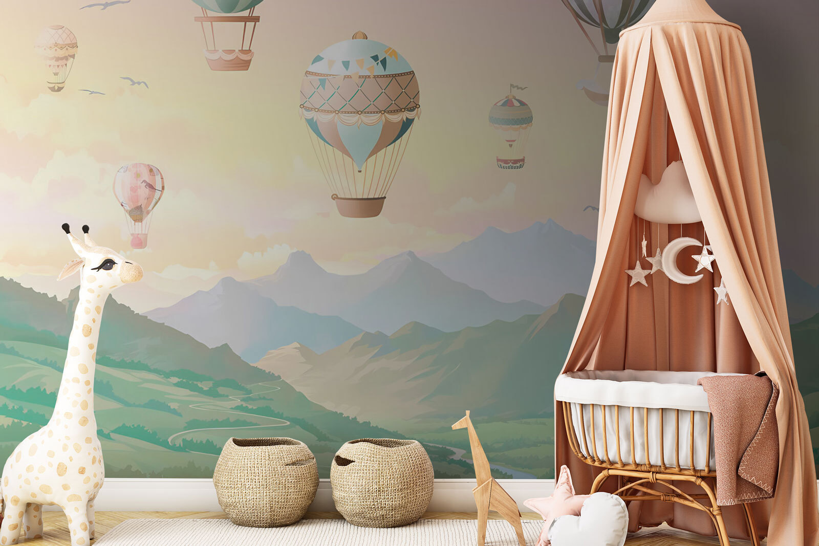 Transforme el espacio de un niño en un caprichoso país de las maravillas con este mural de globos aerostáticos. Imagínatelo: un suave amanecer que proyecta suaves tonos por toda la habitación mientras globos de colores flotan serenamente sobre un paisaje de ensueño. Es como invitar a tu casa a un poco de aventura sin tener que hacer la maleta. Los niños pueden imaginarse volando entre nubes esponjosas o celebrando fiestas del té en el cielo con banderas juguetonas que bailan al compás de la brisa. Y lo mejor de todo es que un mural como éste no sólo despierta la creatividad, sino que también aporta un encanto sereno, perfecto para la hora de la siesta o las sesiones de cuentos. Observa cómo las caritas de los niños se iluminan con sueños de viajes caprichosos; es más que decoración: ¡es una invitación a explorar!