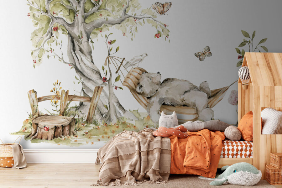 ¿No es una monada? Imagínate este mural, “Oso soñando despierto en una apacible hamaca”, en la habitación de tu pequeño: ¡una escapada de ensueño! Imagínate a un acogedor oso descansando en una hamaca bajo un caprichoso árbol, con mariposas revoloteando a su alrededor. Es como una escena de un cuento de hadas, perfecta para crear esas vibraciones mágicas en guarderías o zonas de juego.