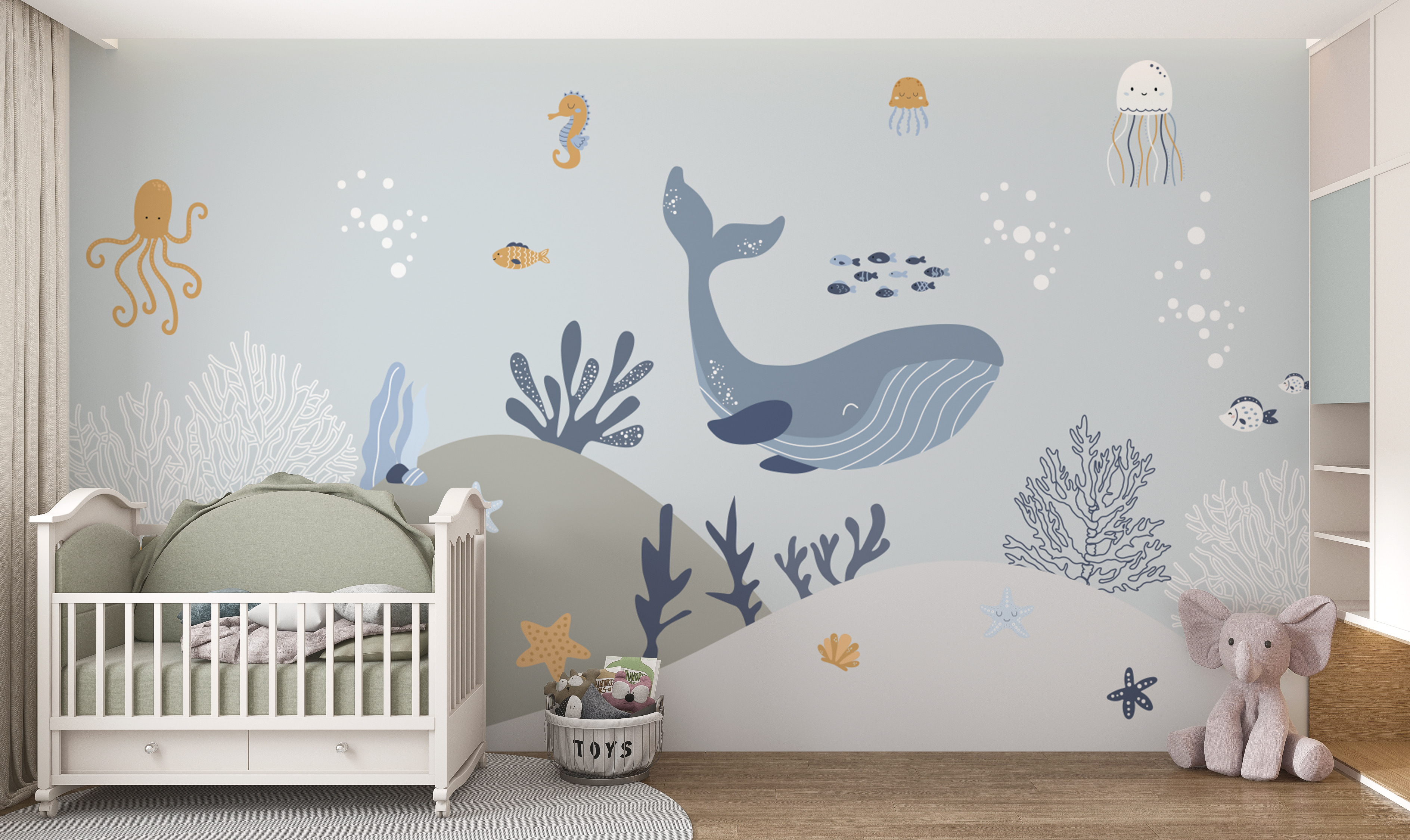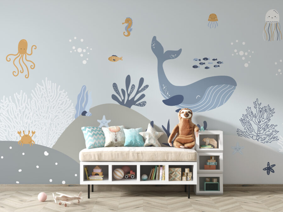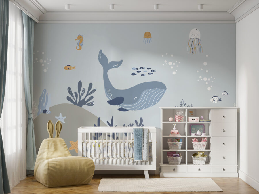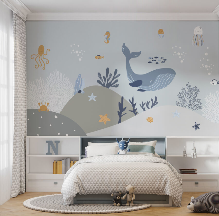 Si añades este mural, las historias sobre amigos submarinos a la hora de dormir serán aún más emocionantes. Los adorables pulpos, ballenas y estrellas de mar parecen cobrar vida, invitando a los niños a vivir innumerables aventuras imaginativas. Además, los suaves colores y las simpáticas criaturas son el telón de fondo perfecto tanto para la siesta como para el recreo.