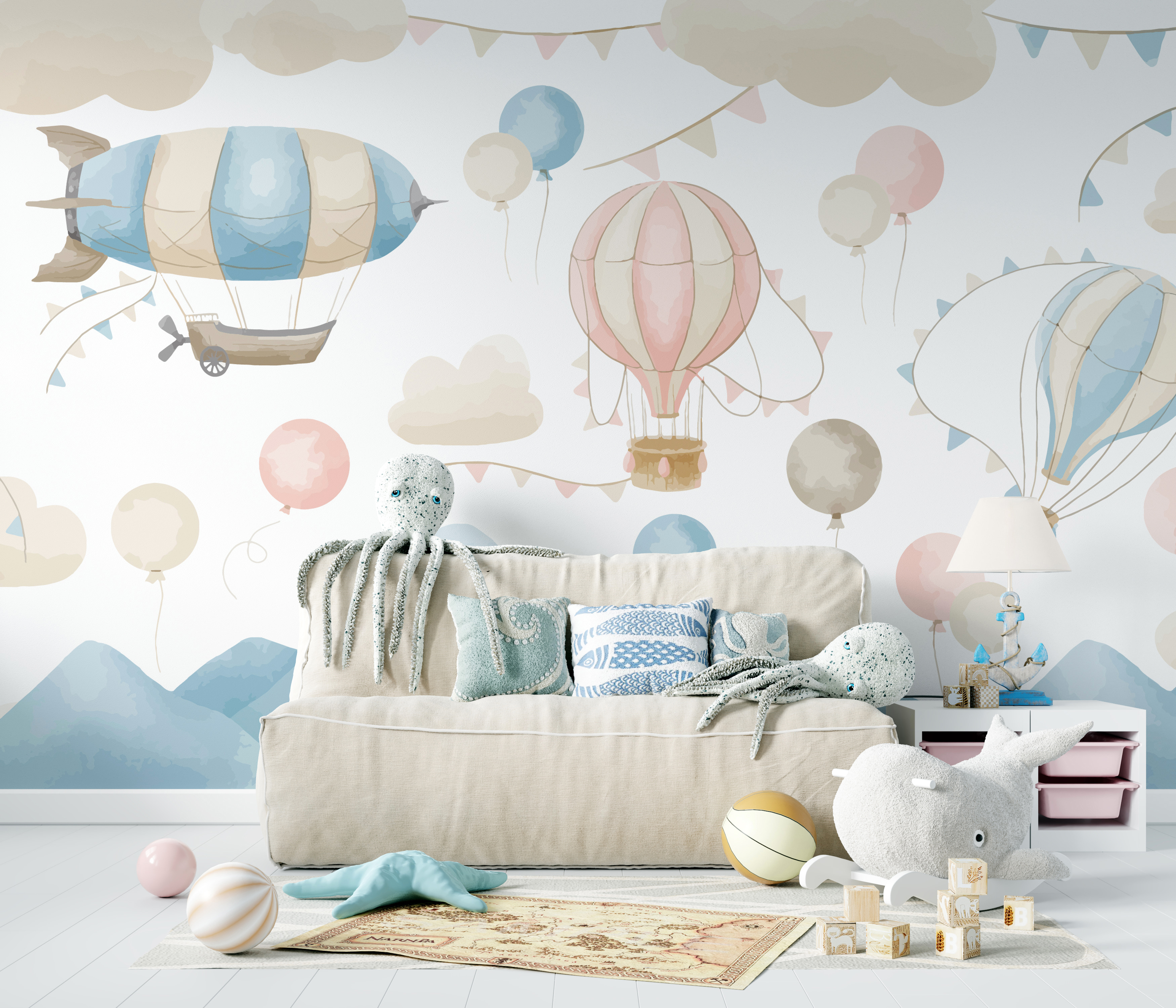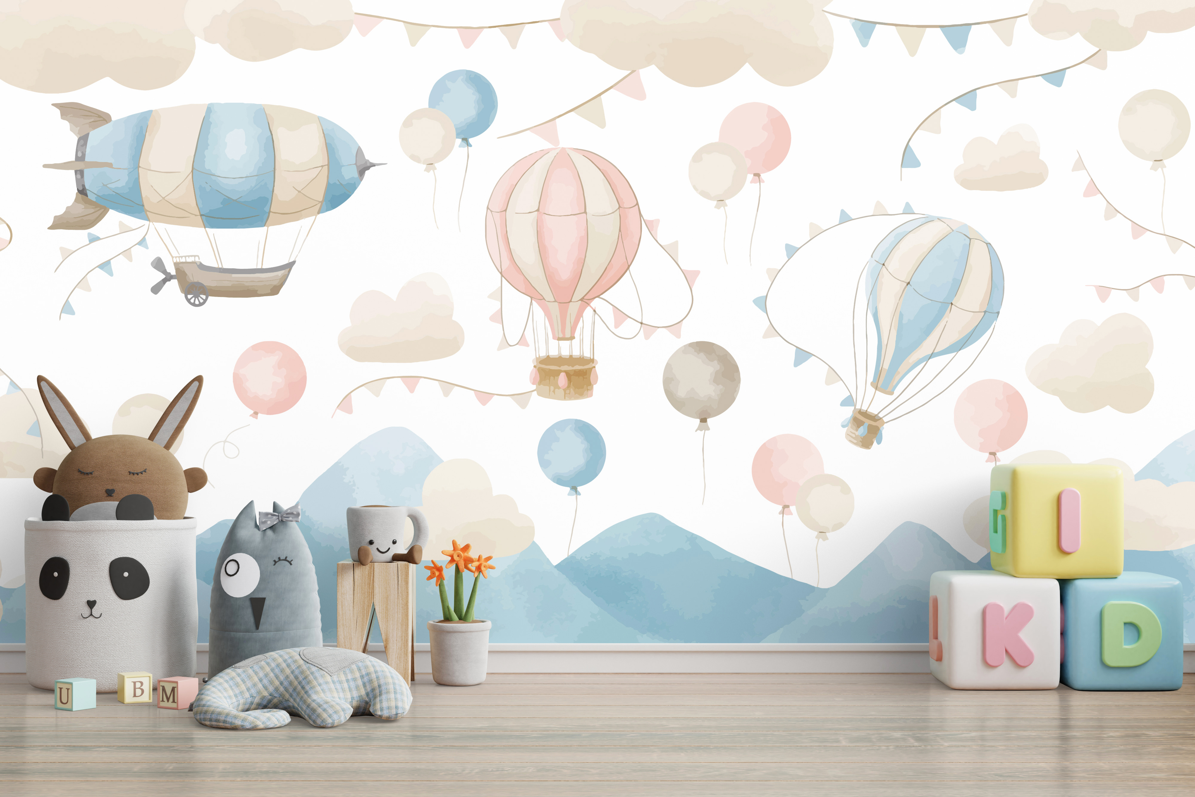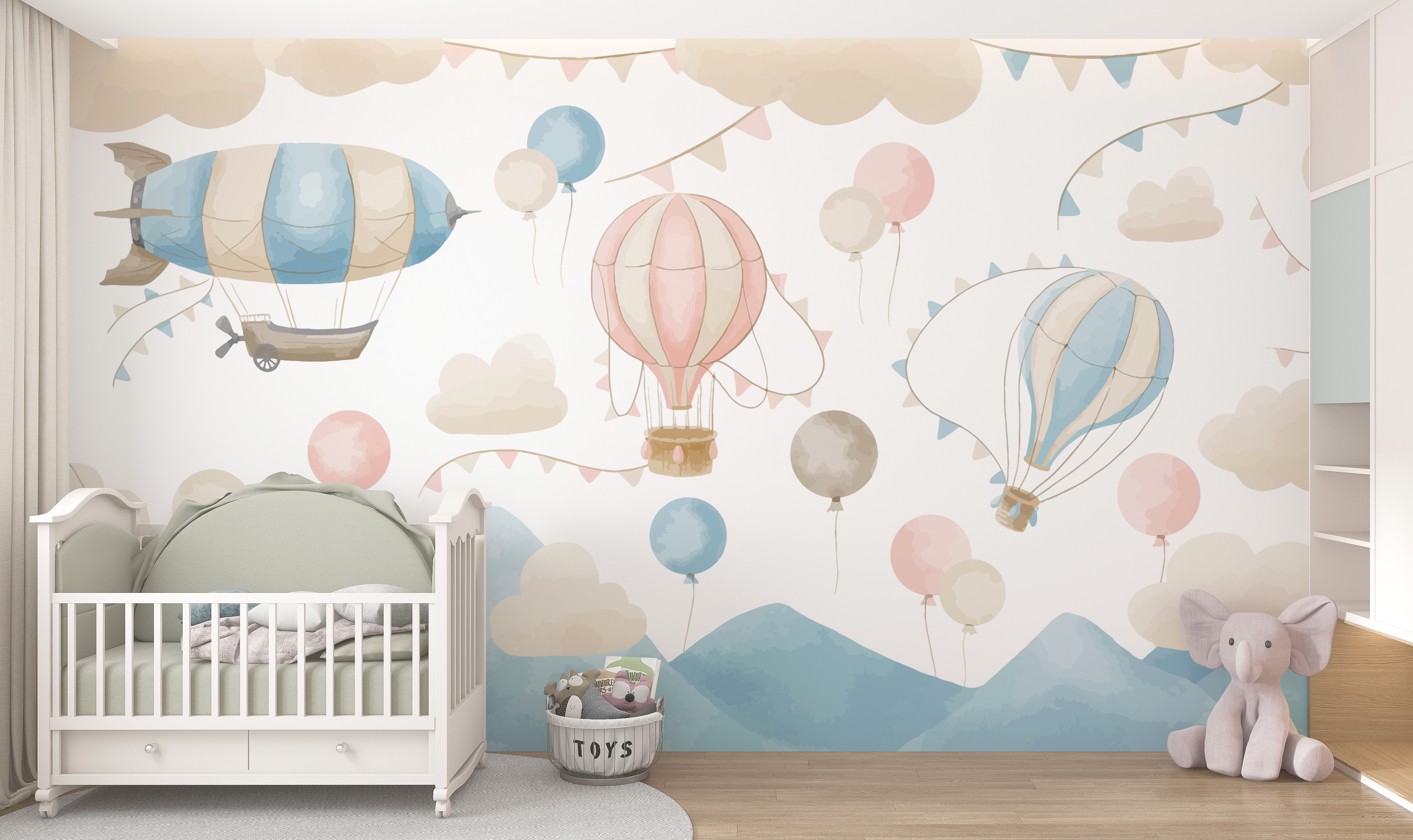 Imagine este adorable mural de pared, con globos aerostáticos rosas y blancos que flotan serenamente entre nubes suaves y banderines de colores pastel. Es como entrar en un mundo de ensueño y fantasía cada vez que entras en la habitación. Perfecto para el espacio de su pequeño, especialmente si le encantan la aventura y la magia. Este mural encaja perfectamente en guarderías, salas de juegos o cualquier espacio que necesite un toque de maravilla.