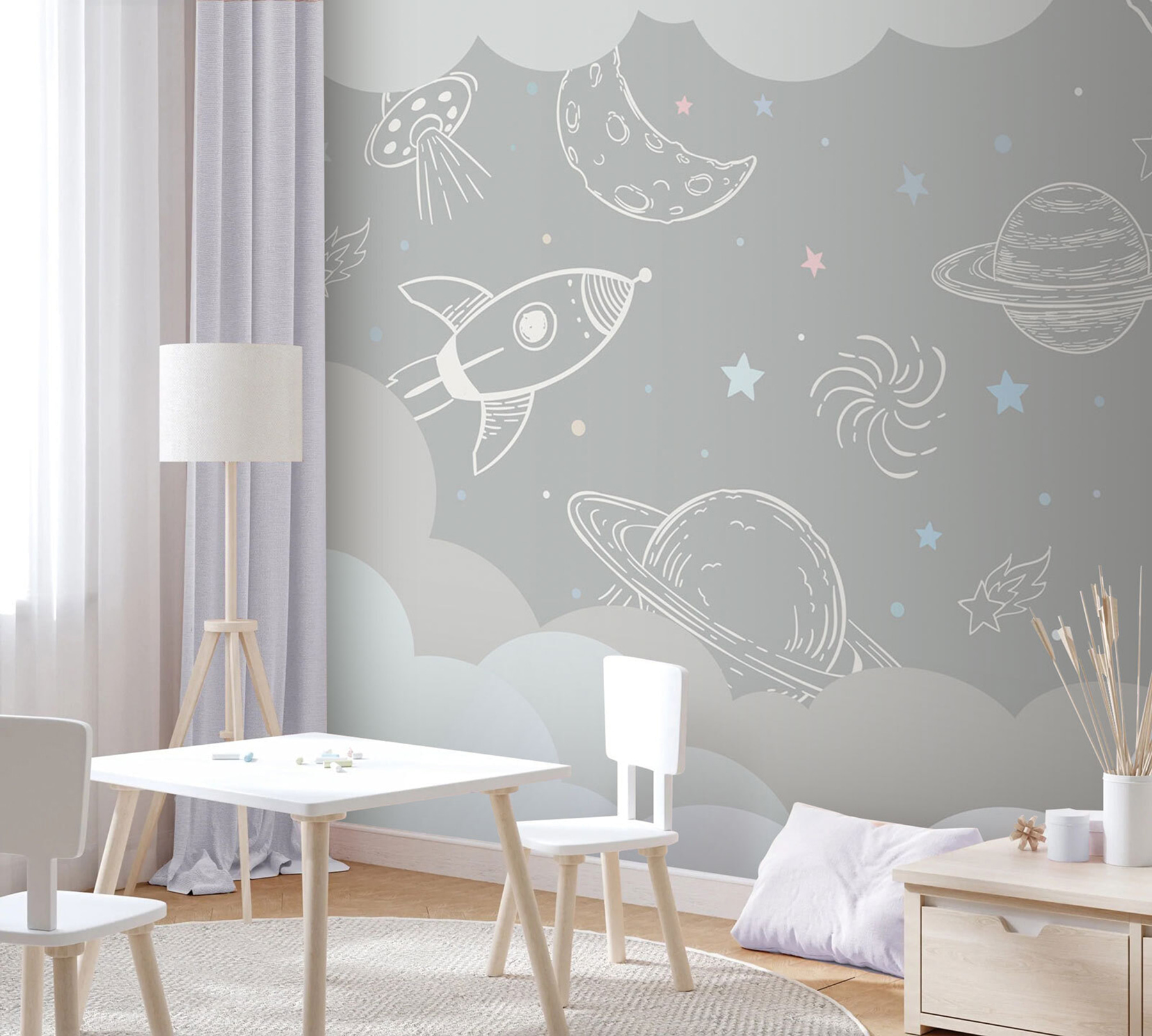 Echa un vistazo a este encantador mural de pared, “Estrella blanca sobre fondo gris”. Es como un viaje de ensueño por el espacio directamente en tu habitación. Perfecto para los niños, especialmente para los que no paran de hablar de cohetes y astronautas. Imagínate a los más pequeños arropándose por la noche, sintiéndose como si estuvieran entre las estrellas. Tiene ese aire de dibujo a mano con naves espaciales, planetas y estrellas, como garabatos de un diario cósmico.