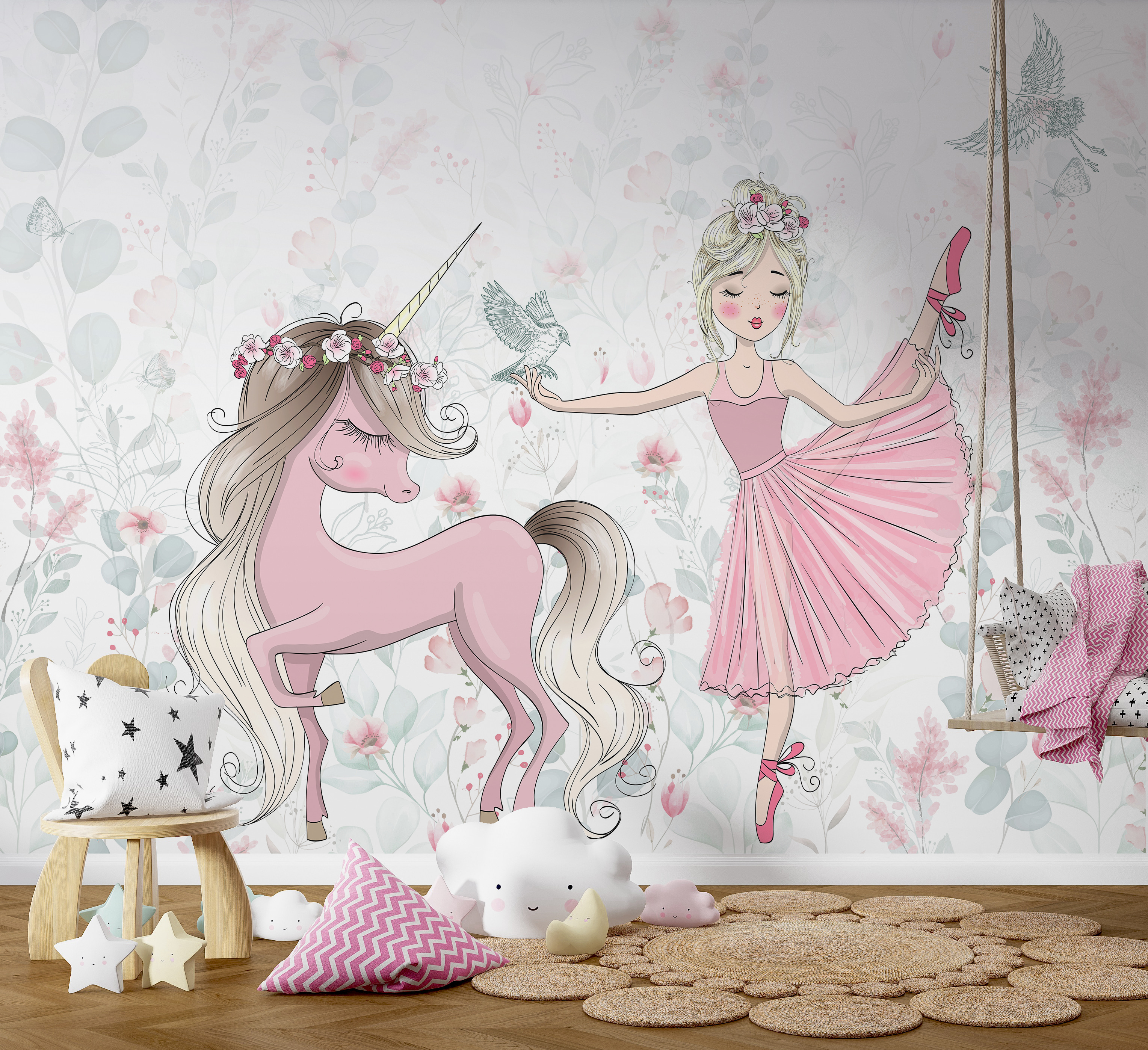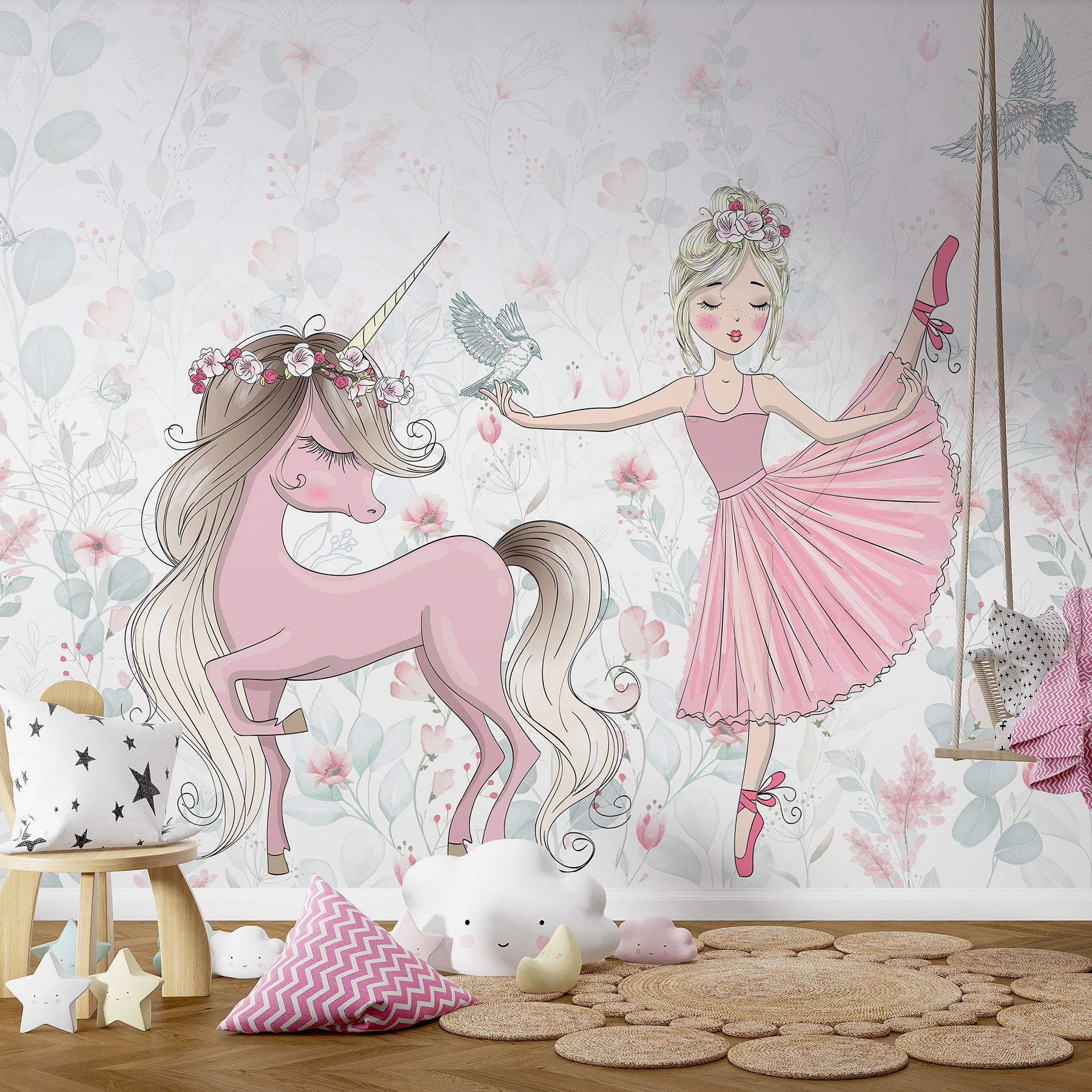 ¿Alguna vez ha soñado con bailar con un unicornio? Este mural de pared “Bailarina y unicornio” da vida a esa mágica fantasía. Ideal para la habitación de un niño, ¡especialmente para las pequeñas bailarinas y los entusiastas de los unicornios! Imagine a su hija despertándose con esto cada mañana, pura delicia. Las suaves flores pastel y los delicados detalles lo convierten en un telón de fondo encantador, perfecto para la hora del cuento o del juego. Es como entrar en un cuento de hadas; los suaves colores y los caprichosos diseños crean un espacio relajante e imaginativo. Parece un momento sacado directamente de un libro de cuentos. No es sólo un mural, es un toque de magia para cualquier habitación. De verdad, ¿no puedes oír las risitas y ver los giros?