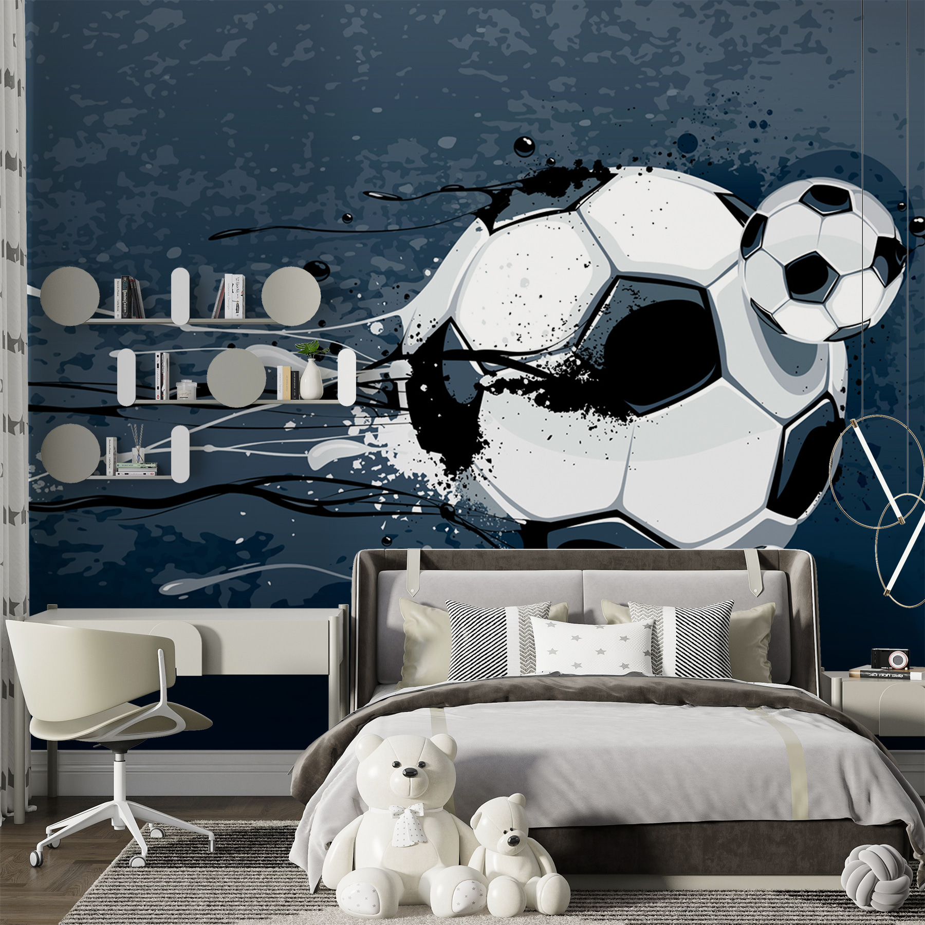 Acaba con el aburrimiento con este impresionante mural de pared. “El balón de fútbol entra en acción” capta la emoción del juego, por lo que es perfecto para la habitación de cualquier joven deportista. Imagina a tu pequeño despertándose con esta vibrante escena, listo para ponerse las zapatillas. Es divertido, enérgico y aporta un aire lúdico sin ser demasiado exagerado. Piensa en todos los partidos imaginarios que podrían jugarse con este atrevido telón de fondo: ¡deja que fluya la creatividad! Además, podría inspirar a una futura estrella del fútbol o, al menos, suscitar animados debates sobre los mejores equipos. ¿A quién no le gusta un mural que haga sonreír a todo el mundo?