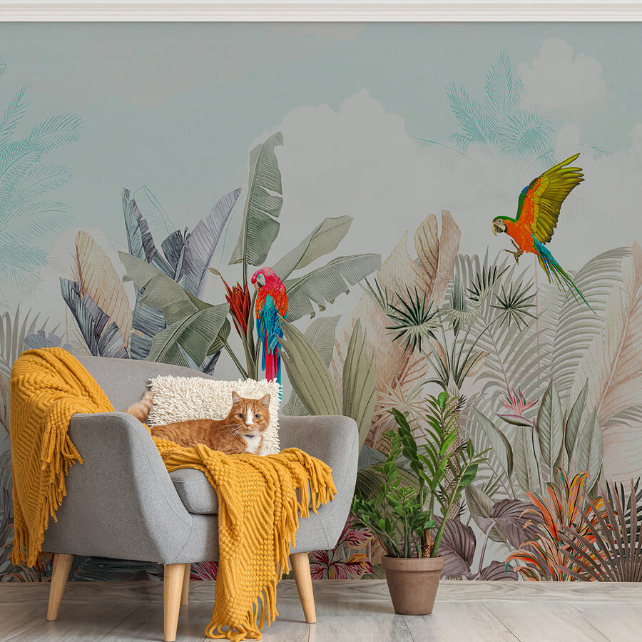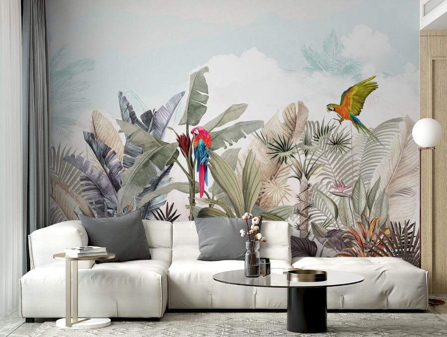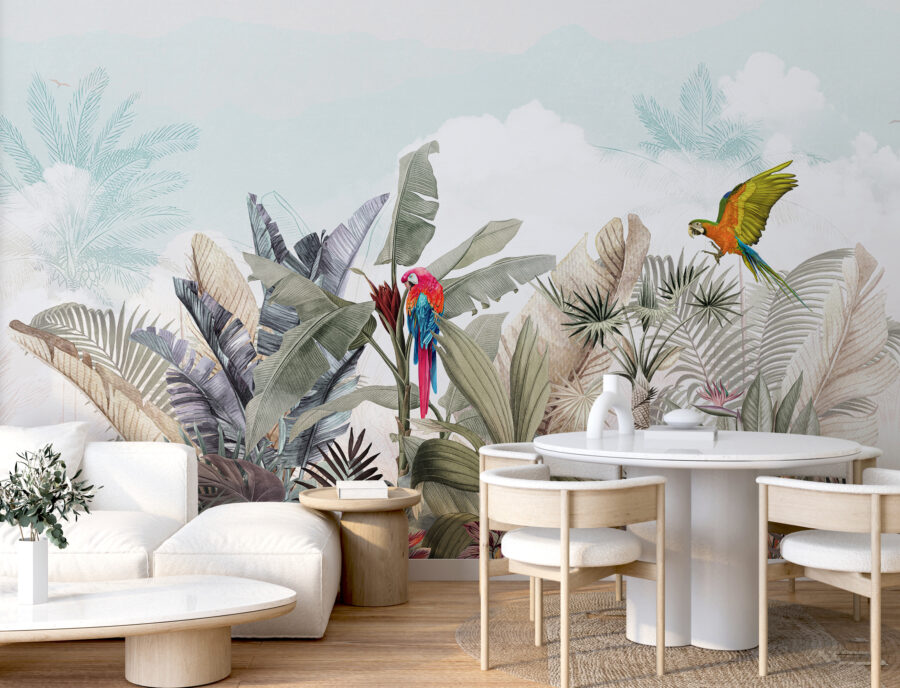 Te presentamos tu nueva obsesión mural: el mural “Colorful Parrot Flying in the Air”. Es como encontrar el sueño de un observador de aves aterrizado justo en tu salón. Imagine dos vibrantes loros planeando sobre frondosos verdes y flores tropicales. Es como unas minivacaciones en la selva tropical, pero sin mosquitos, ¡menos mal!