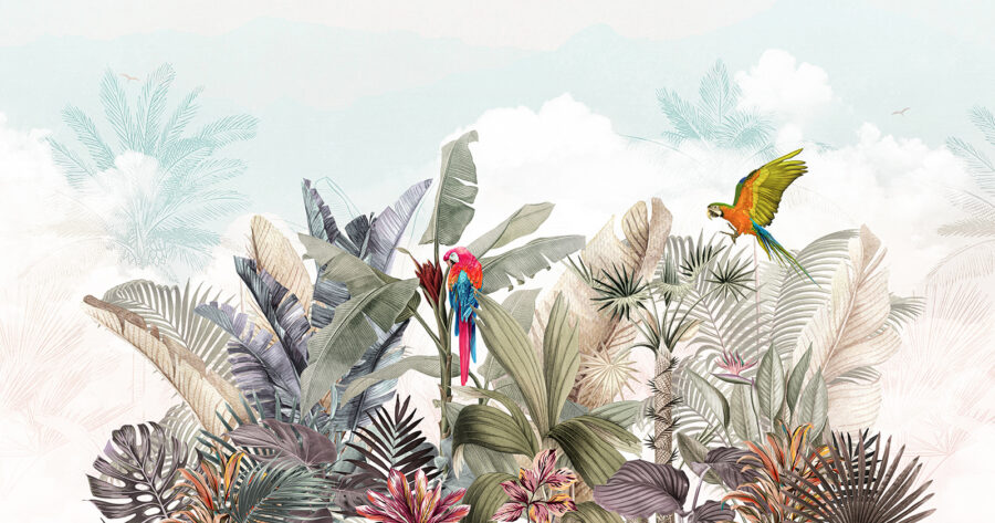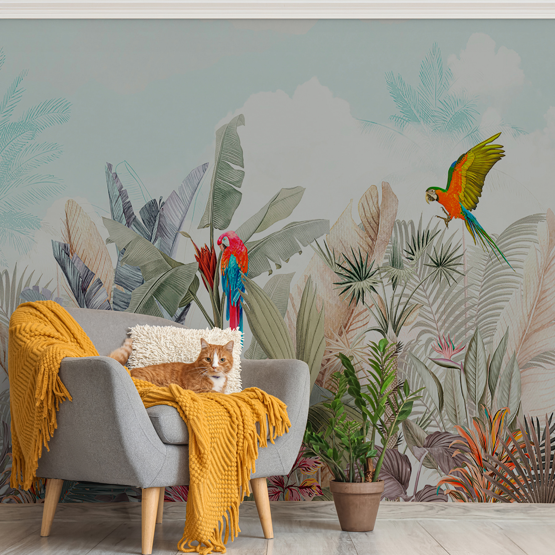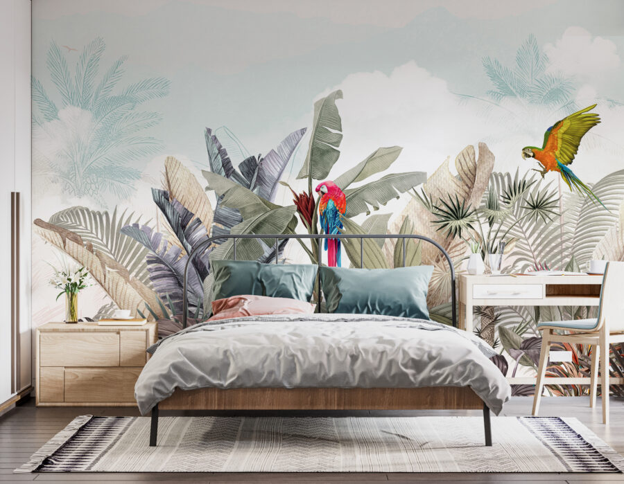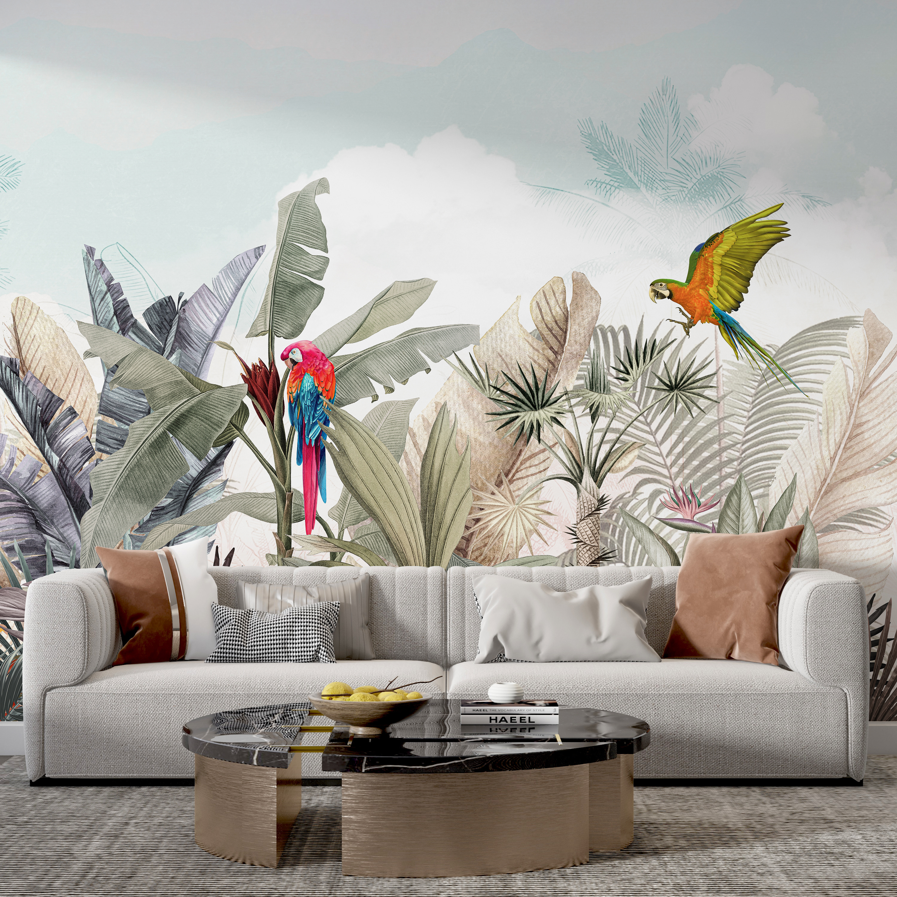 Te presentamos tu nueva obsesión mural: el mural “Colorful Parrot Flying in the Air”. Es como encontrar el sueño de un observador de aves aterrizado justo en tu salón. Imagine dos vibrantes loros planeando sobre frondosos verdes y flores tropicales. Es como unas minivacaciones en la selva tropical, pero sin mosquitos, ¡menos mal!