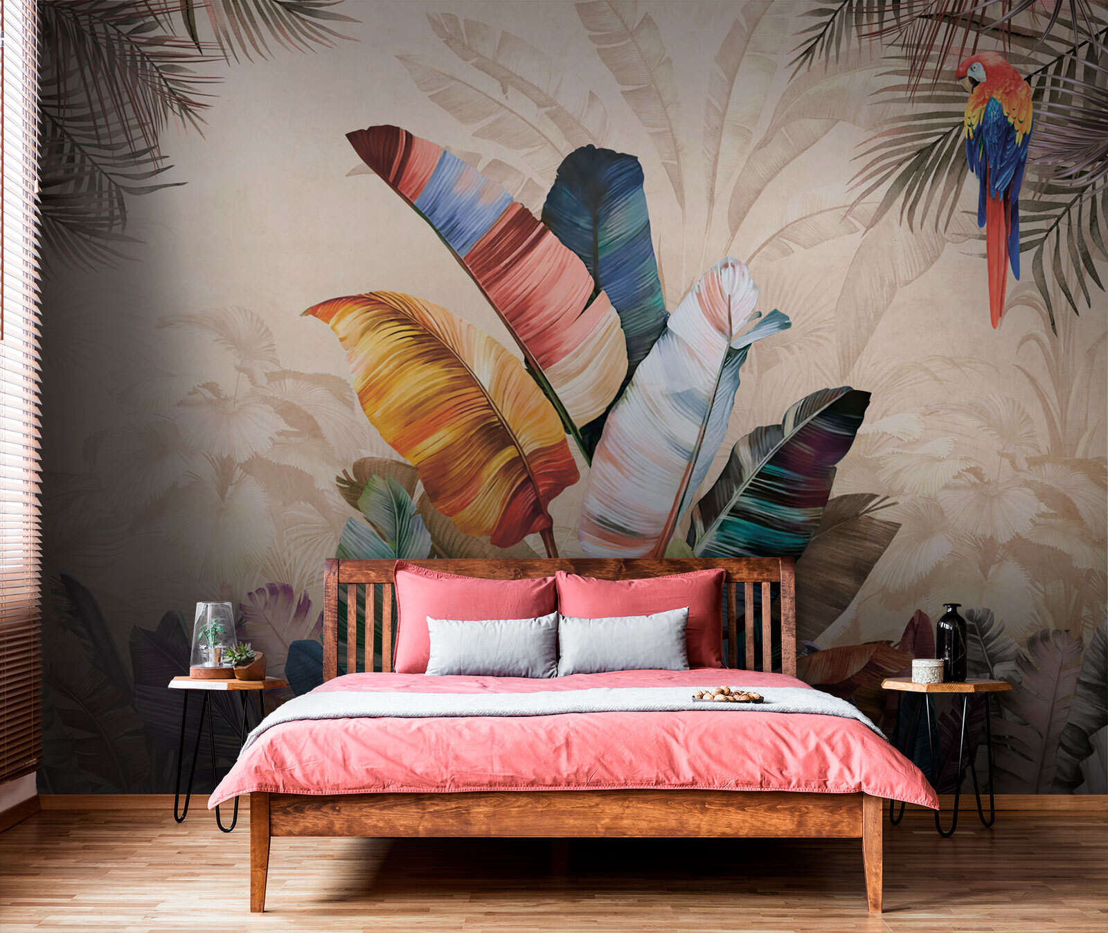 Transforma cualquier habitación en una escapada tropical con este vibrante mural de selva. Imagina que entras en un exuberante paraíso donde danzan llamativas hojas de palmera y un colorido loro vigila. Es el telón de fondo perfecto para las tardes perezosas, las charlas de café o una ráfaga de inspiración mientras trabajas desde casa. La forma en que esas hojas resaltan sobre el fondo suave hace que parezca verano todo el año. Los amigos pensarán que alguien se ha ido de viaje mientras tú te sientas y disfrutas del sol de cada día, sin quemaduras. ¿Quién no querría sentirse tan cerca de la naturaleza sin moverse del sofá?
