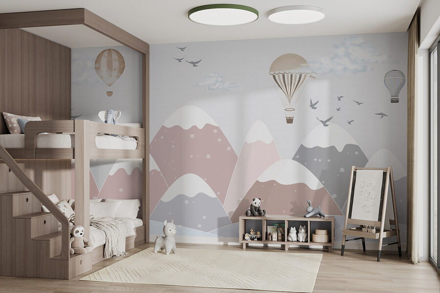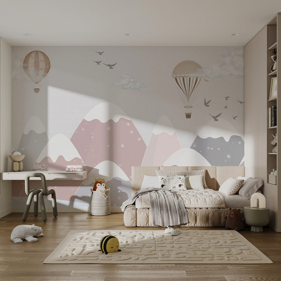 ¿Te imaginas cuentos para dormir bajo este mural? Contando historias de viajes en globo sobre las montañas. Tiene un aspecto clásico y atemporal, pero con un toque suave y moderno. Por algo está entre los murales más populares. Ilumina el espacio con encanto y calidez.