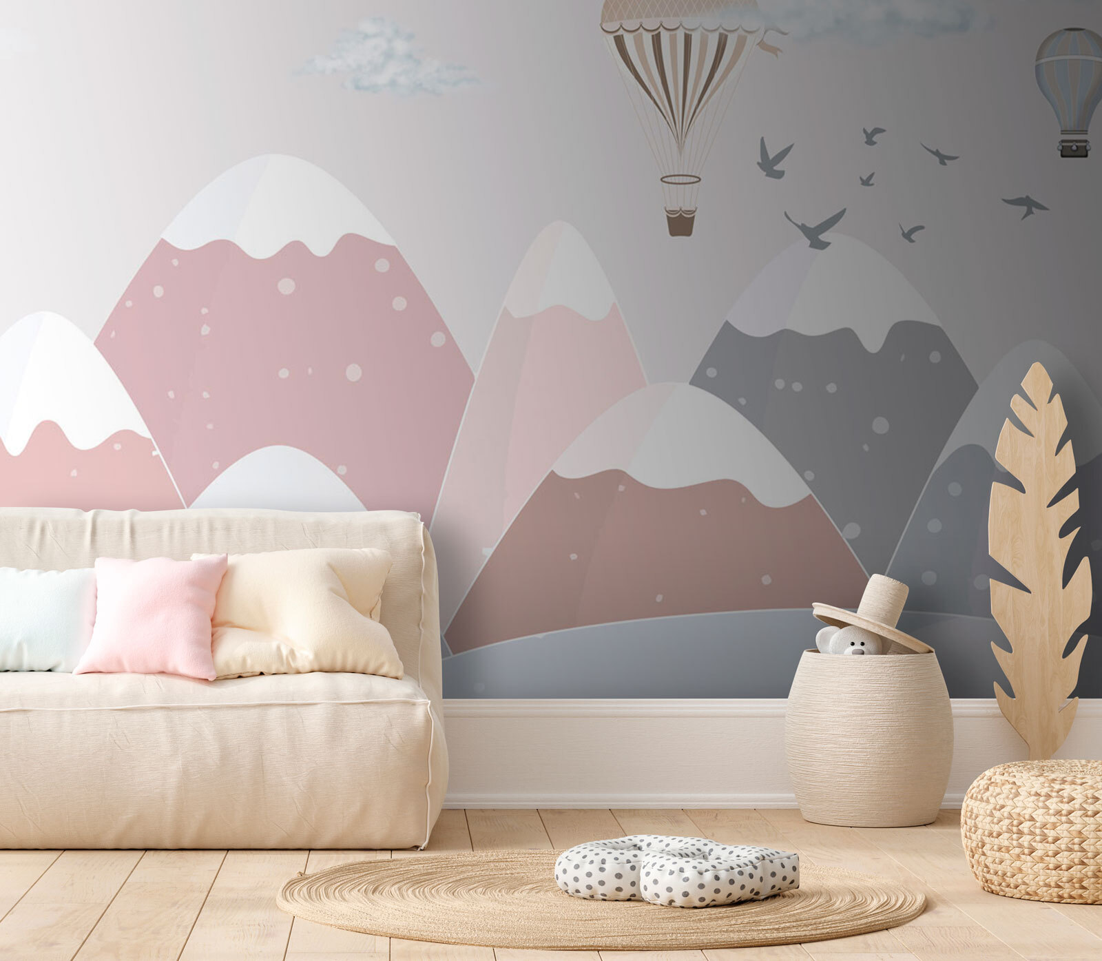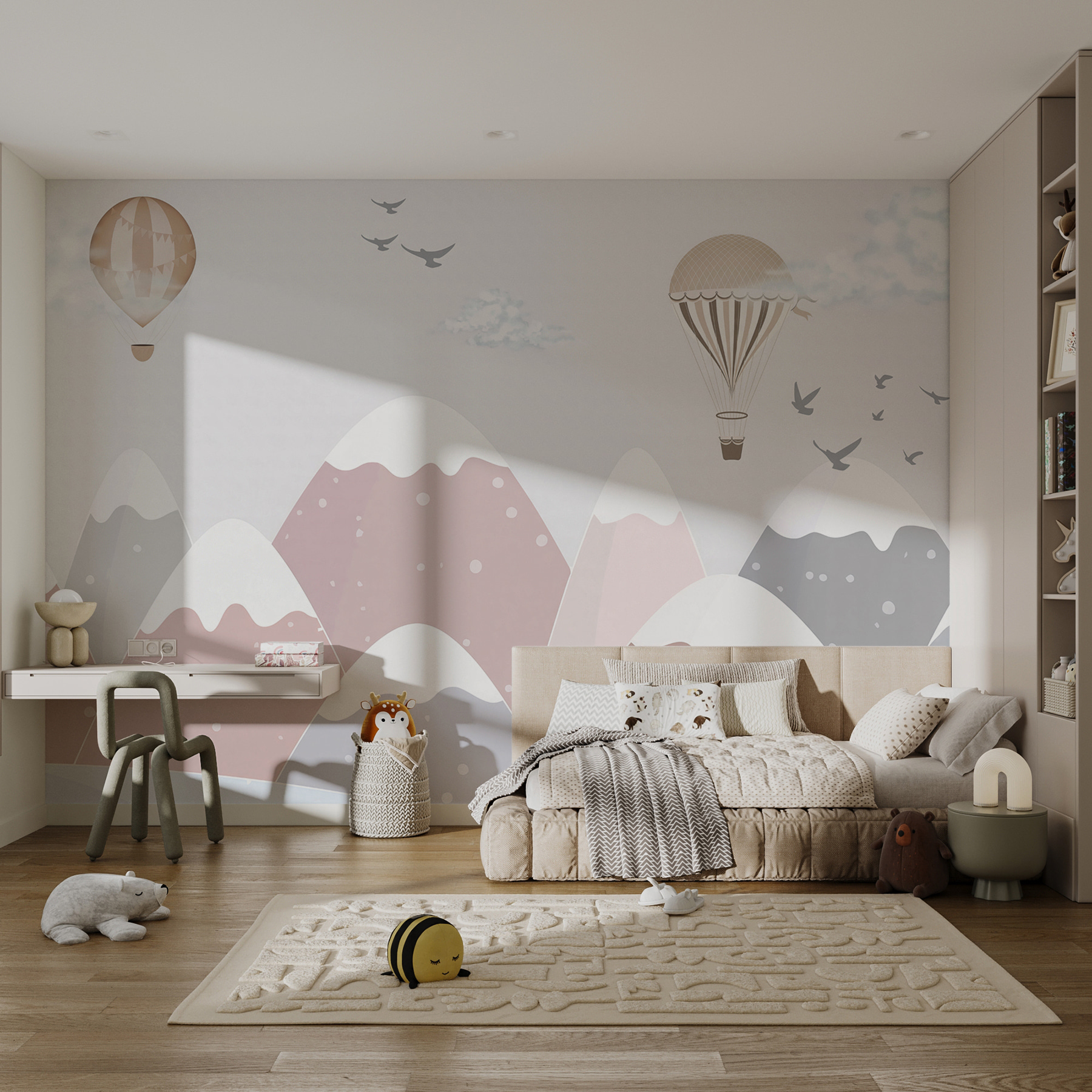 ¿Te imaginas cuentos para dormir bajo este mural? Contando historias de viajes en globo sobre las montañas. Tiene un aspecto clásico y atemporal, pero con un toque suave y moderno. Por algo está entre los murales más populares. Ilumina el espacio con encanto y calidez.