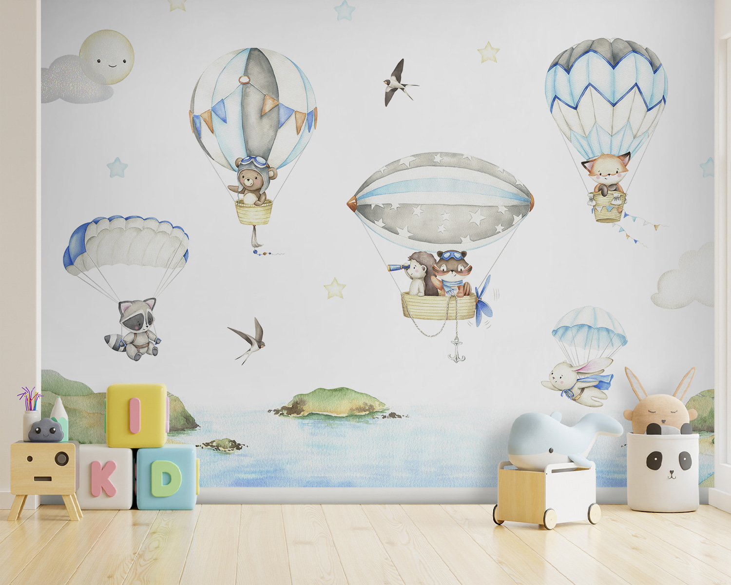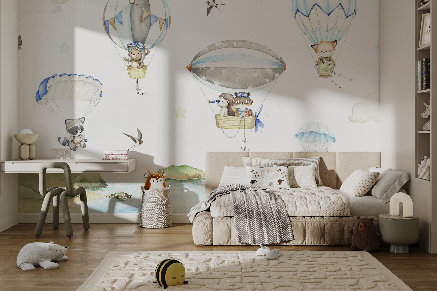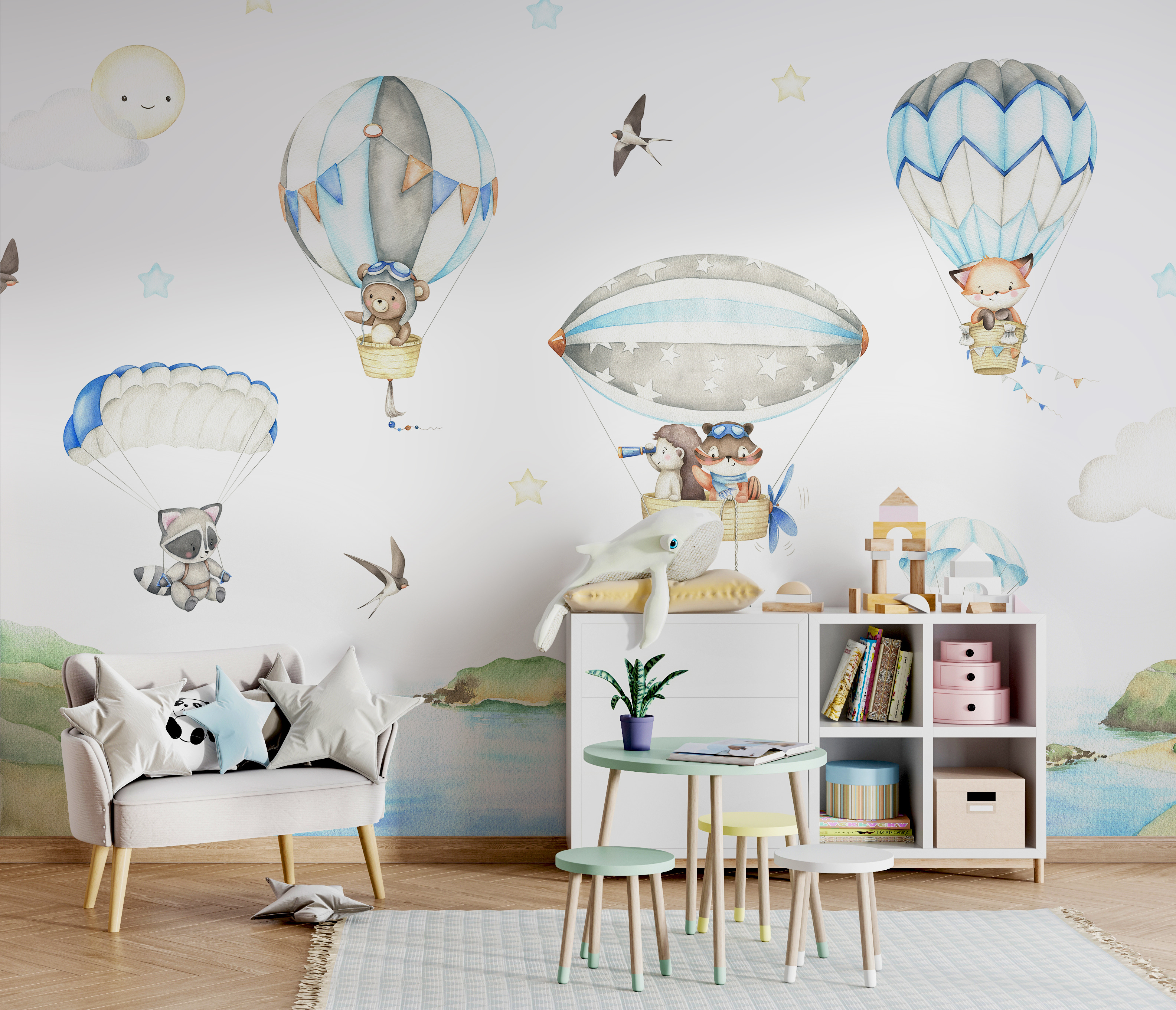 ¿Por qué conformarse con paredes lisas cuando puedes llevar a tu pequeño de aventura con este adorable mural? “Oso de peluche en globo” es demasiado bonito para resistirse. Imagina un dulce osito de peluche, ataviado con unas gafas de aviador, flotando suavemente por el cielo. El encanto de esta escena de ensueño es perfecto para suscitar infinitas historias y calmar los sueños nocturnos. Perfecto para guarderías o habitaciones infantiles, añade un toque juguetón que es seguro y suave para los ojos. En serio, ¿a quién no le gustaría despertarse con esto cada mañana? Es como entrar en un libro ilustrado donde cada día es una nueva aventura en el cielo. Los suaves tonos pastel y los caprichosos personajes no sólo atraen las miradas, sino que también levantan el ánimo. La habitación de tu hijo se transformará al instante en un refugio mágico y acogedor donde los globos aerostáticos y los sueños por las nubes cobrarán vida.