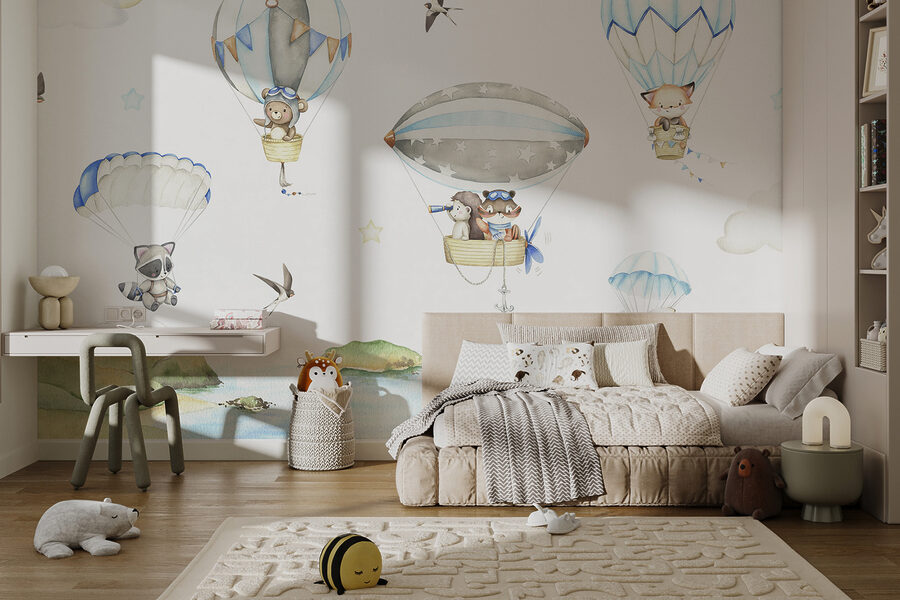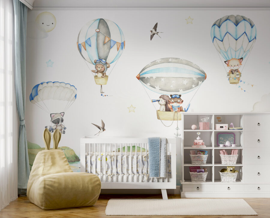 ¿Por qué conformarse con paredes lisas cuando puedes llevar a tu pequeño de aventura con este adorable mural? “Oso de peluche en globo” es demasiado bonito para resistirse. Imagina un dulce osito de peluche, ataviado con unas gafas de aviador, flotando suavemente por el cielo. El encanto de esta escena de ensueño es perfecto para suscitar infinitas historias y calmar los sueños nocturnos. Perfecto para guarderías o habitaciones infantiles, añade un toque juguetón que es seguro y suave para los ojos. En serio, ¿a quién no le gustaría despertarse con esto cada mañana? Es como entrar en un libro ilustrado donde cada día es una nueva aventura en el cielo. Los suaves tonos pastel y los caprichosos personajes no sólo atraen las miradas, sino que también levantan el ánimo. La habitación de tu hijo se transformará al instante en un refugio mágico y acogedor donde los globos aerostáticos y los sueños por las nubes cobrarán vida.