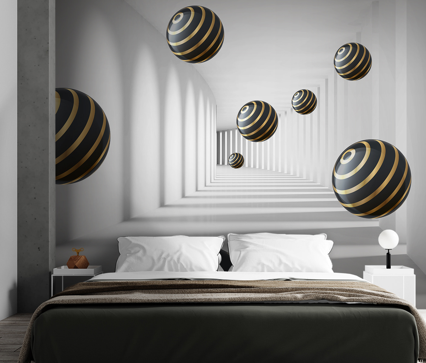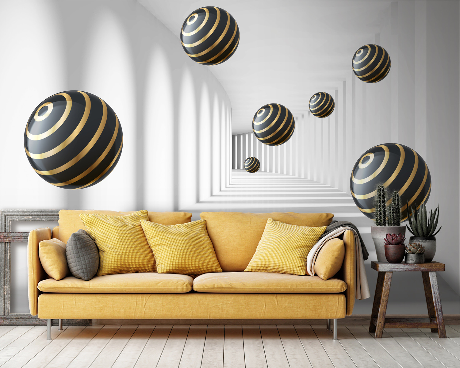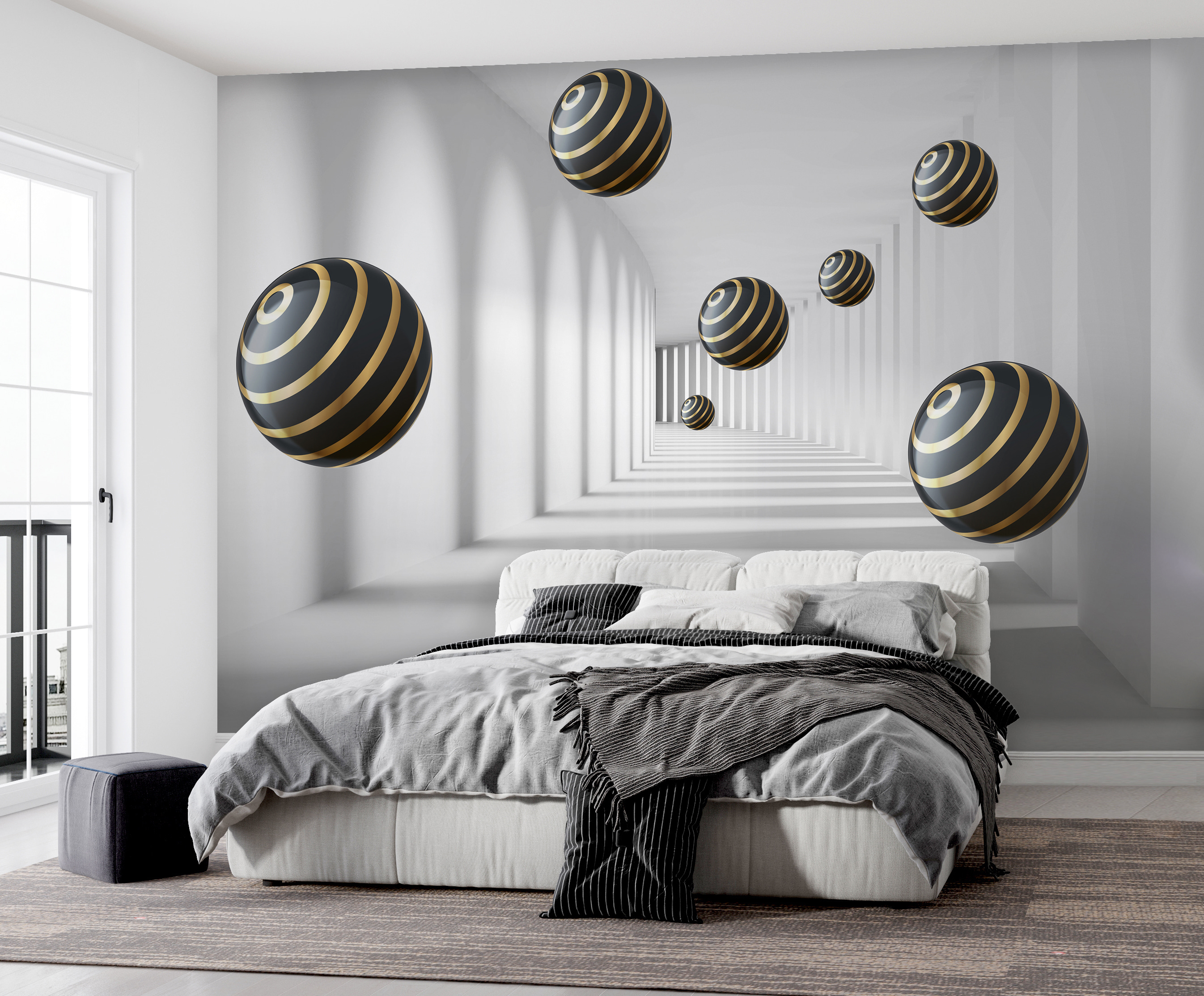 Imagine entrar en una habitación y sentir que entra directamente en otra dimensión. Eso es exactamente lo que hace el “Mural de pared Esferas a rayas flotando en pasillo blanco”. Es un diseño moderno, casi hipnótico, que te hace sentir como en un túnel futurista. Las esferas, con sus elegantes rayas, parecen flotar sin esfuerzo, creando una sensación de profundidad que puede hacer que tu espacio parezca más grande. Es como tener tu propia película de ciencia ficción en la pared.
