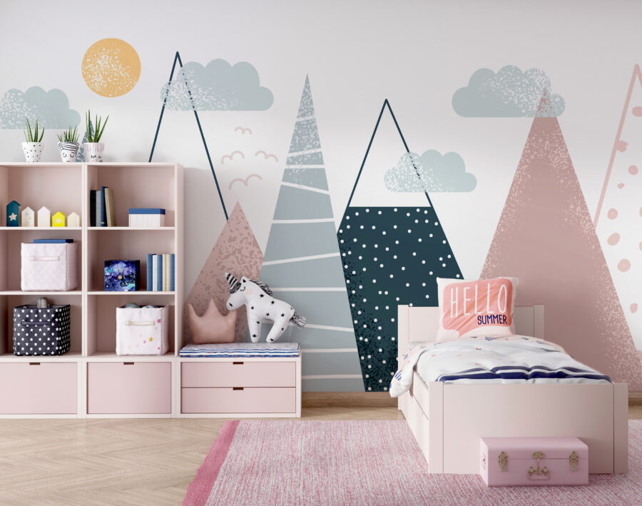 Lleva el aire libre al interior de tu casa con este encantador mural de montañas geométricas bajo un brillante cielo iluminado por el sol. Es como unas minivacaciones en las paredes, perfecto para despertar la imaginación en las habitaciones o zonas de juego de los niños. Los colores suaves combinados con motivos caprichosos lo hacen realmente encantador. Imagínate a un niño durmiéndose a la deriva, soñando con aventuras en la montaña o nubes que le susurran historias… Dulce, ¿verdad? Además, es una forma rápida de decorar cualquier espacio sin grandes complicaciones. Incluso puede que las paredes se sonrojen un poco. En serio, este mural tiene magia por todas partes.