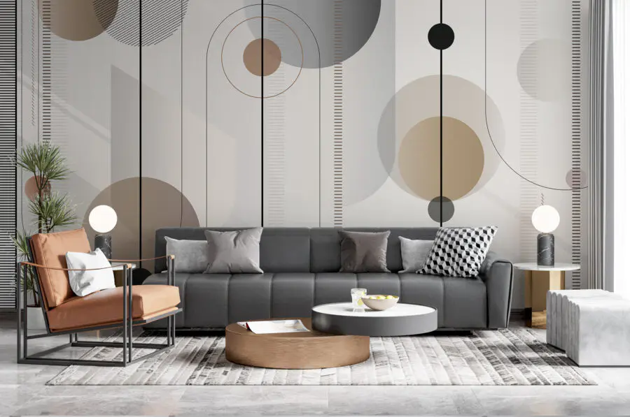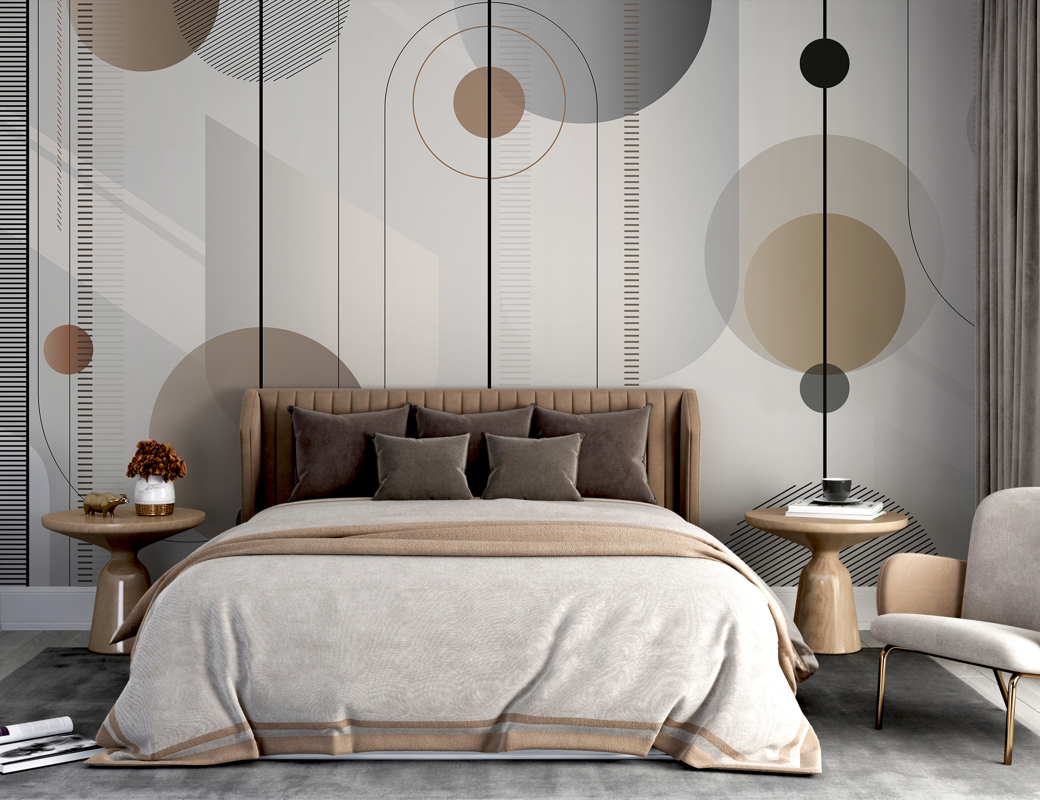 Transforme su espacio con este llamativo mural, con motivos geométricos de tonos cálidos que bailan por las paredes. Imagínese entrar en una habitación acogedora y elegante al mismo tiempo, donde las curvas y las líneas crean un ritmo que hace que todo parezca un poco más vivo. Es como invitar a una obra de arte moderno a tu casa. Perfecto para cualquier pared que se sienta un poco sola, este mural podría inspirar un poco de creatividad o incluso un baile. Aporte calidez y alegría a su decoración: ¡sus paredes se lo agradecerán!