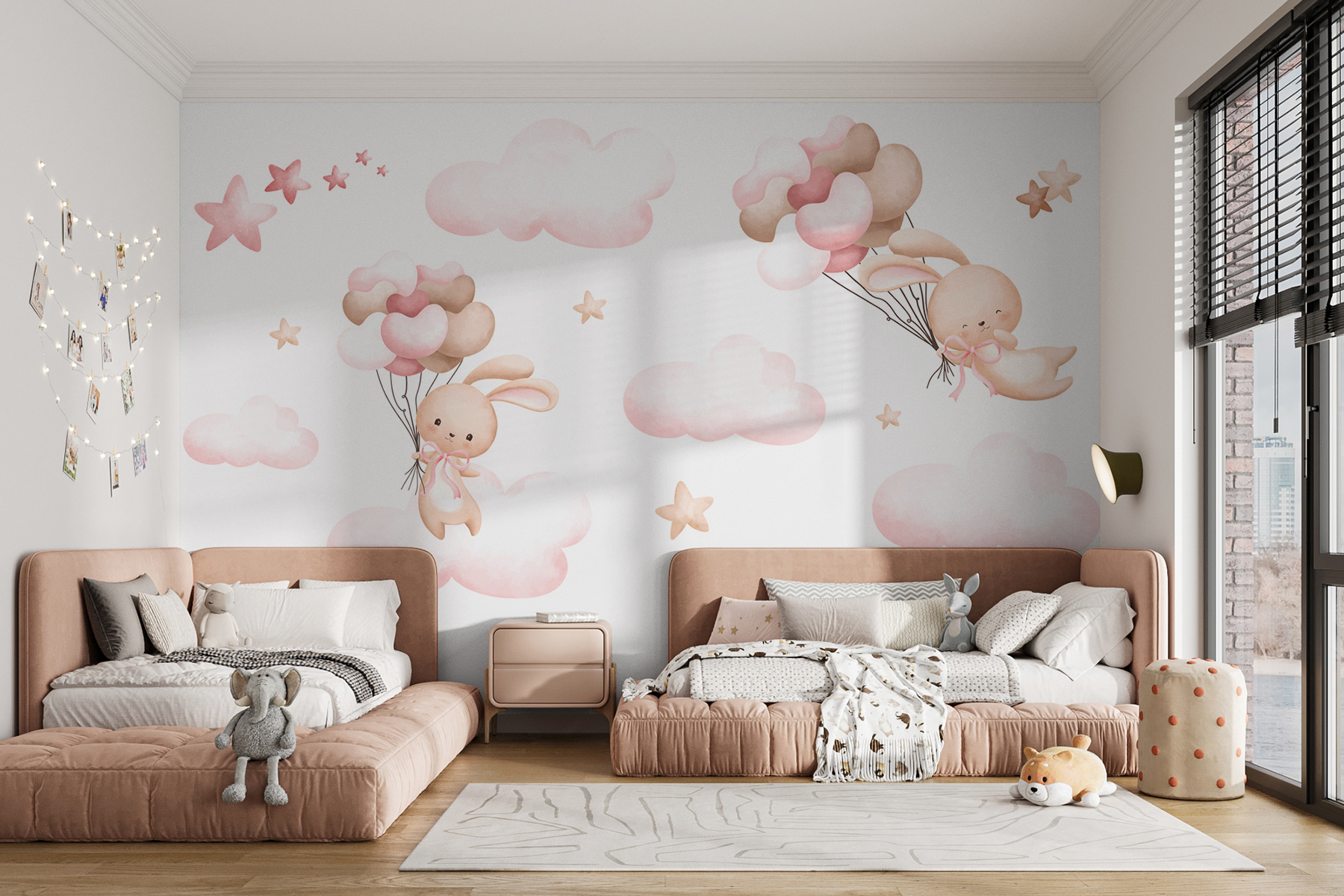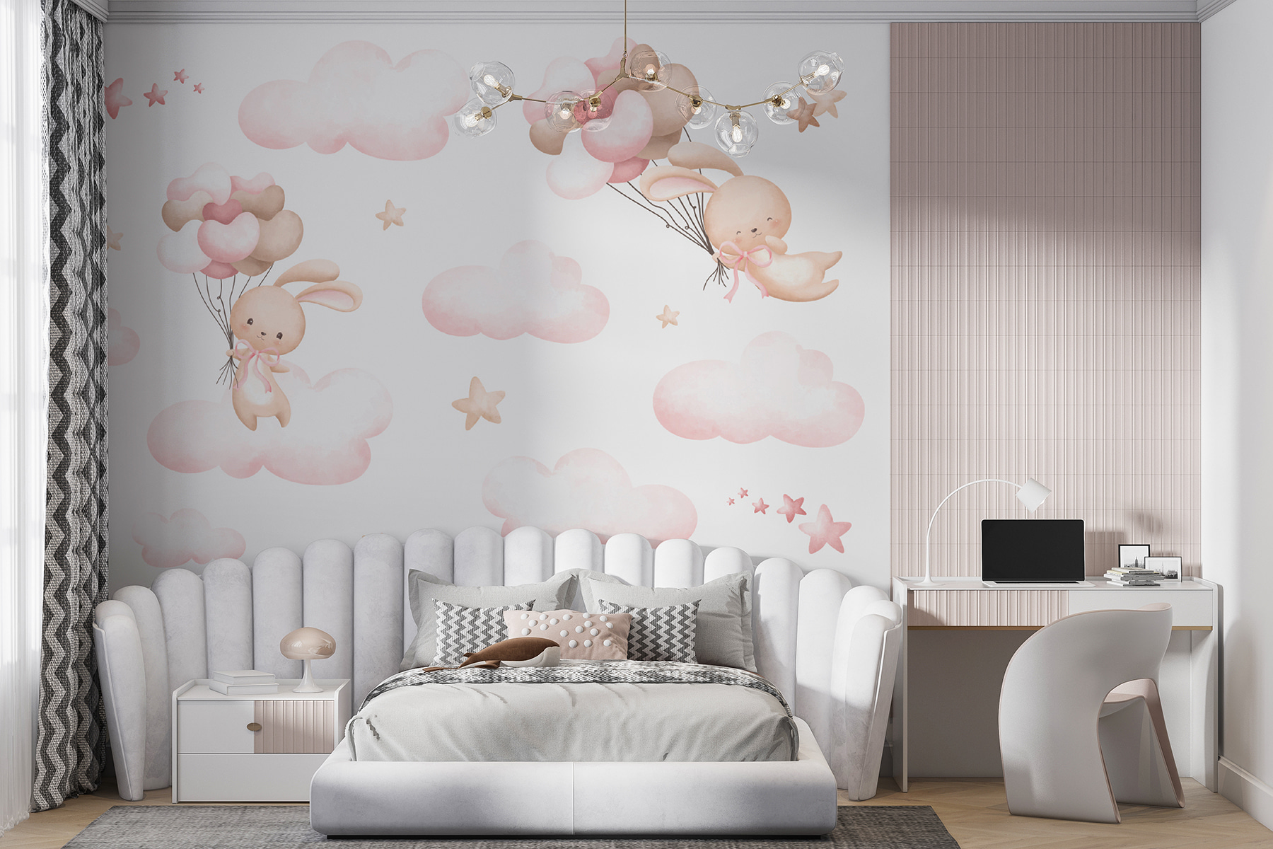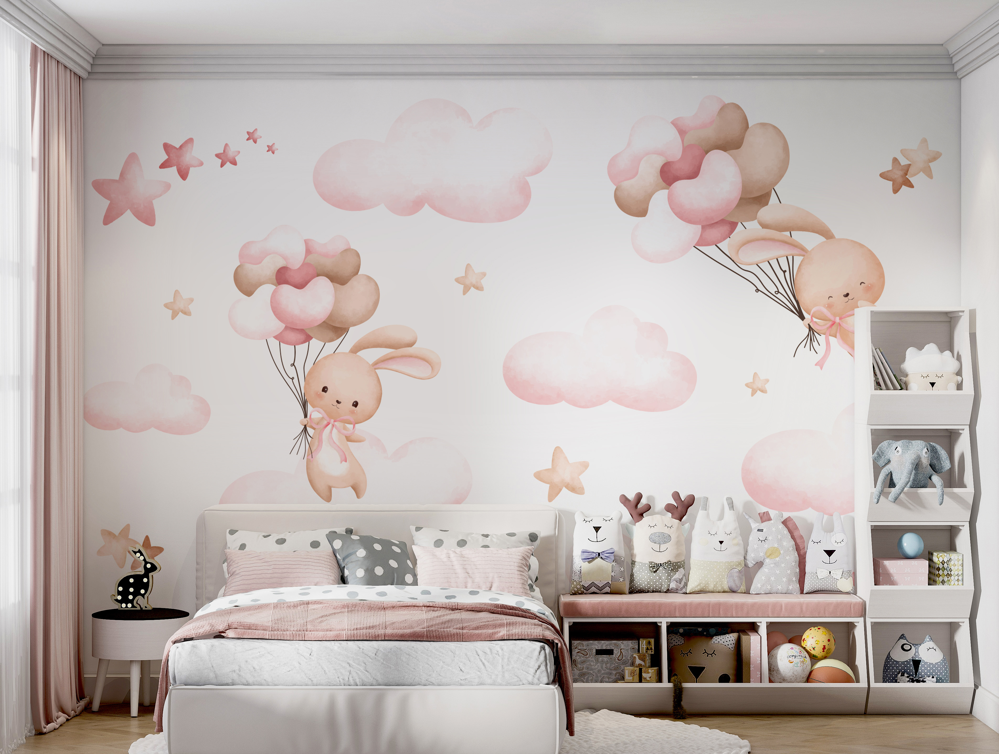 Ilumina el espacio de cualquier pequeño con este encantador mural de pared en el que aparece un encantador conejito flotando entre nubes esponjosas y estrellas centelleantes. Imagina la alegría de la cara de un niño mientras contempla esta caprichosa escena y deja volar su imaginación hacia aventuras de ensueño. Los colores suaves crean una atmósfera relajante, perfecta para relajarse después de un largo día de juego. Es como un suave abrazo para su habitación, que invita a disfrutar de acogedores cuentos y dulces sueños. Transforma esas paredes en blanco en un cielo mágico y observa cómo cada rincón se llena de calidez y asombro. Imagínatelo: acurrucados bajo las sábanas, con los ojos muy abiertos de emoción, soñando con aventuras de conejitos. Un telón de fondo perfecto para las risitas de los más pequeños.