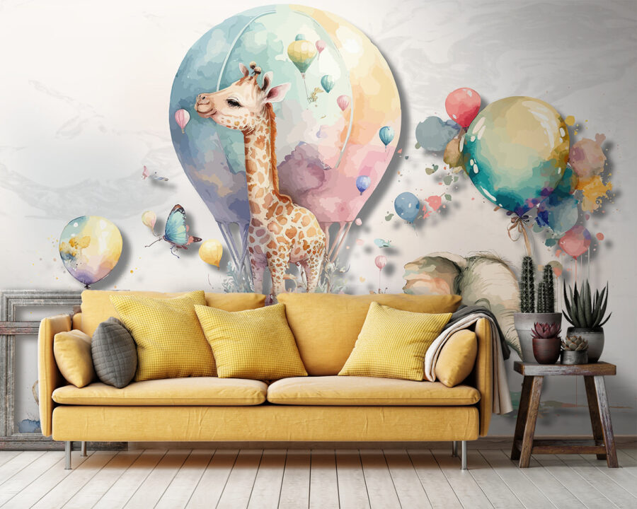 Transforme cualquier espacio con el encantador mural de pared “Acuarela de un león”. Esta encantadora obra de arte presenta un encantador bebé león, una graciosa jirafa flotando en un globo aerostático y un adorable elefante sosteniendo globos de colores, todo ello pintado en suaves acuarelas de ensueño. Es perfecta para añadir un toque de fantasía a las habitaciones infantiles, zonas de juego o cualquier lugar que necesite un toque de magia.
