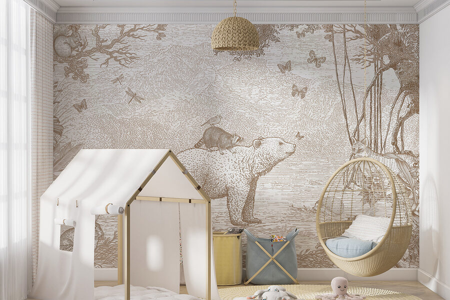Imagínatelo: un encantador mapache encaramado felizmente a lomos de un oso, rodeado de amigos del bosque. Este mural de pared, perfecto para la habitación de cualquier niño, parece una página sacada directamente de un encantador libro de cuentos. Los tonos sepia apagados le dan un aire atemporal, haciéndolo relajante y acogedor, como un suave abrazo para los ojos. Despertará un sinfín de historias antes de dormir y de imaginación juguetona. Imagina los ojos de tu pequeño iluminándose cada noche. Un telón de fondo perfecto para la hora del recreo, la siesta y todos los momentos acogedores intermedios. Cautivador, caprichoso y ¡tan adorable!