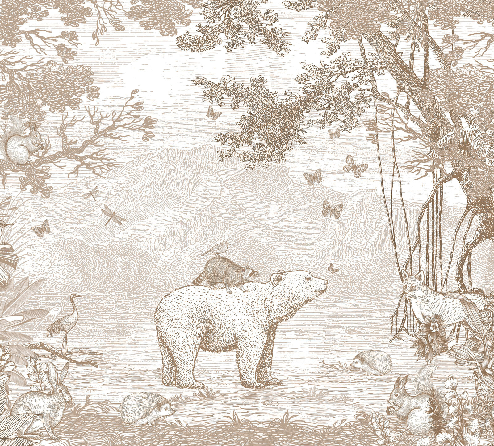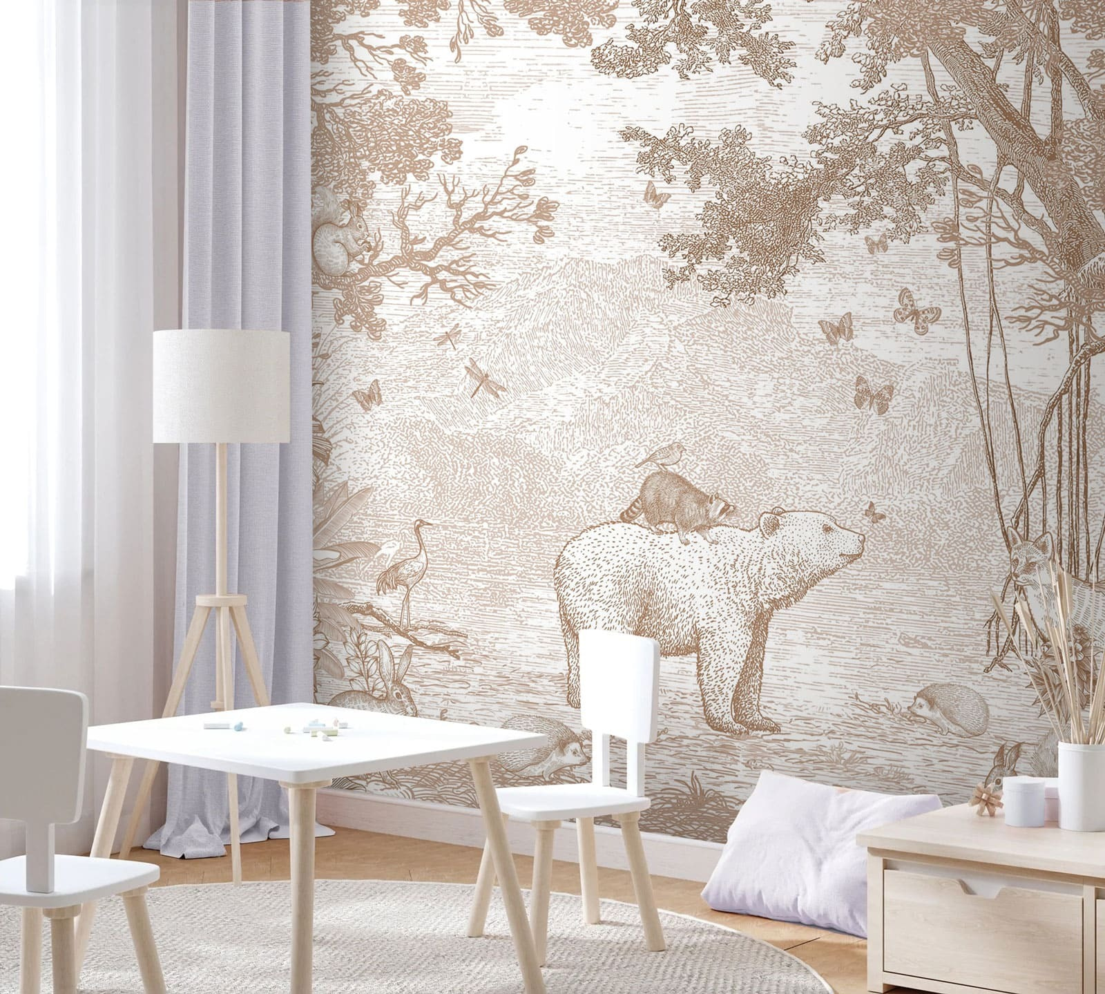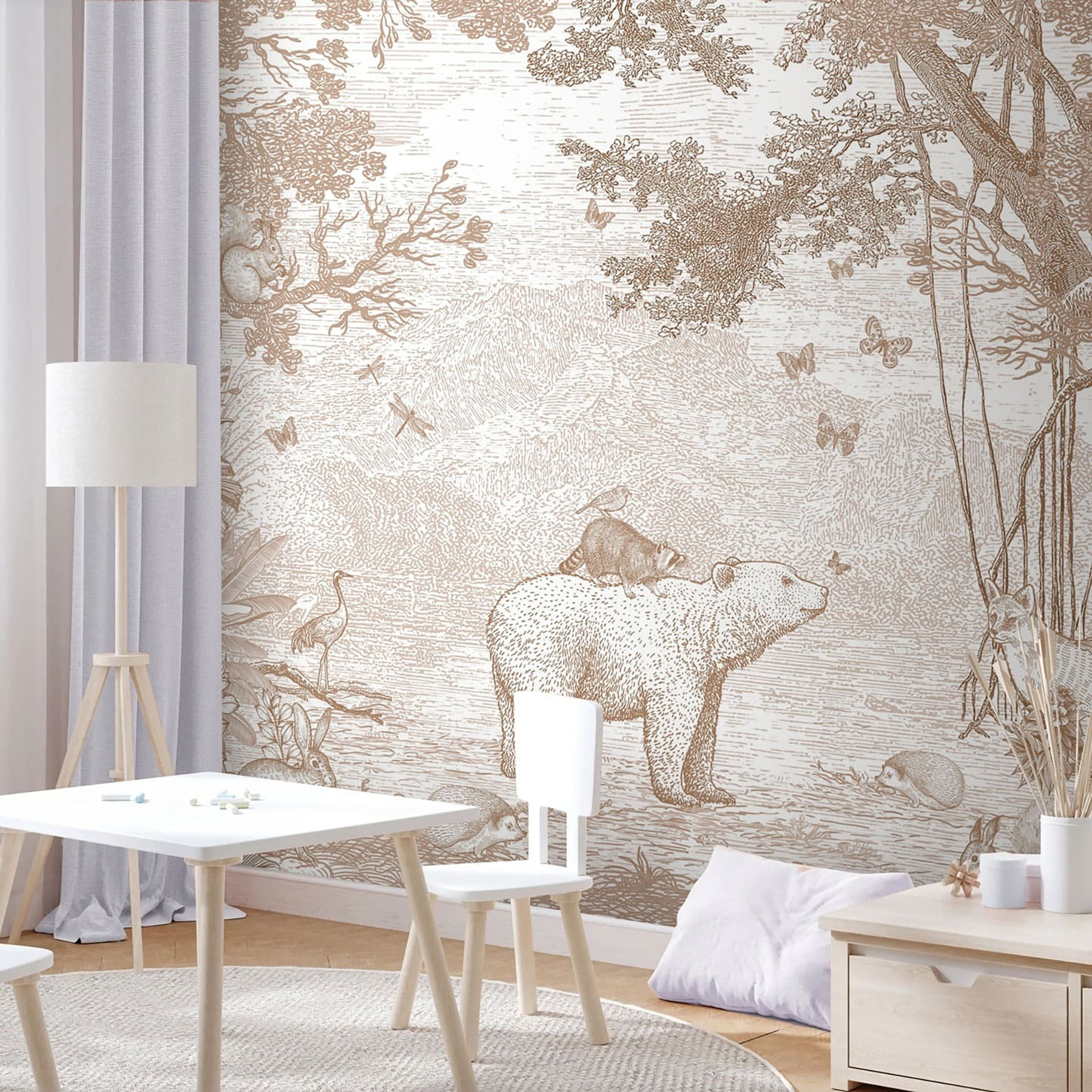 Imagínatelo: un encantador mapache encaramado felizmente a lomos de un oso, rodeado de amigos del bosque. Este mural de pared, perfecto para la habitación de cualquier niño, parece una página sacada directamente de un encantador libro de cuentos. Los tonos sepia apagados le dan un aire atemporal, haciéndolo relajante y acogedor, como un suave abrazo para los ojos. Despertará un sinfín de historias antes de dormir y de imaginación juguetona. Imagina los ojos de tu pequeño iluminándose cada noche. Un telón de fondo perfecto para la hora del recreo, la siesta y todos los momentos acogedores intermedios. Cautivador, caprichoso y ¡tan adorable!