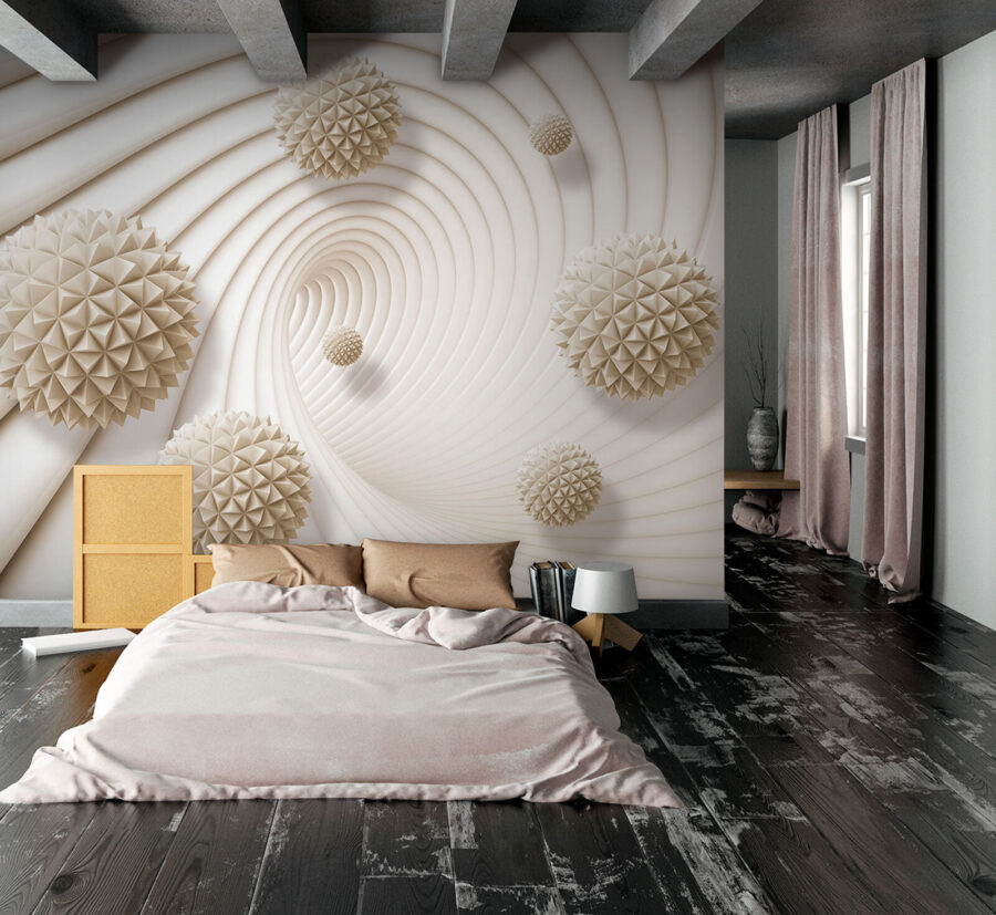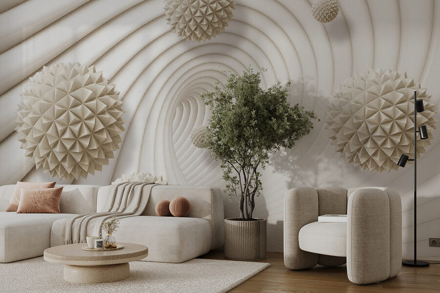 Imagínese entrar en una habitación y sentir que acaba de entrar en una galería de arte moderna y elegante. Este mural, con sus esferas blancas abstractas cubiertas de triángulos, añade al instante un fresco efecto de túnel 3D a su espacio. Es como sumergirse en una dimensión futurista – sin salir de la comodidad de su propia casa. La mezcla de geometría y profundidad hace que cualquier habitación resulte un poco más intrigante. Es el tipo de diseño que suscita conversaciones, tanto si estás descansando con un buen libro como celebrando una reunión informal. Un pequeño toque de estilo vanguardista para elevar el ambiente cotidiano y convertir las paredes anodinas en un punto de fascinación.