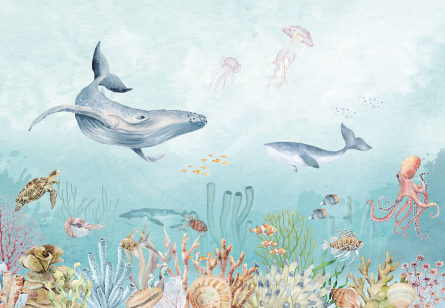 Sumérjase en un mar de maravillas con este cautivador mural de pared “Vida submarina”. Imagine transformar una habitación sencilla en un paraíso oceánico repleto de juguetonas criaturas marinas y vibrantes arrecifes de coral. Perfecto para despertar la imaginación de niños y bebés por igual, este mural trae la magia del azul profundo directamente a su hogar. Aquí hay una ballena gigante, ¡y mira! Un pequeño grupo de peces payaso jugando al escondite entre las anémonas. Ya sea en la habitación infantil de su hijo o en un cuarto de baño caprichoso, añade al instante un toque de aventura y tranquilidad. ¿No puede oír el suave murmullo del agua y el suave movimiento de los tentáculos del pulpo? Instálelo en su espacio y verá cómo se abren de par en par los ojos con deleite (y quizá alguna que otra risita). Es más que un mural, es una escapada submarina sin mojarse, así que adelante, ¡date un chapuzón!