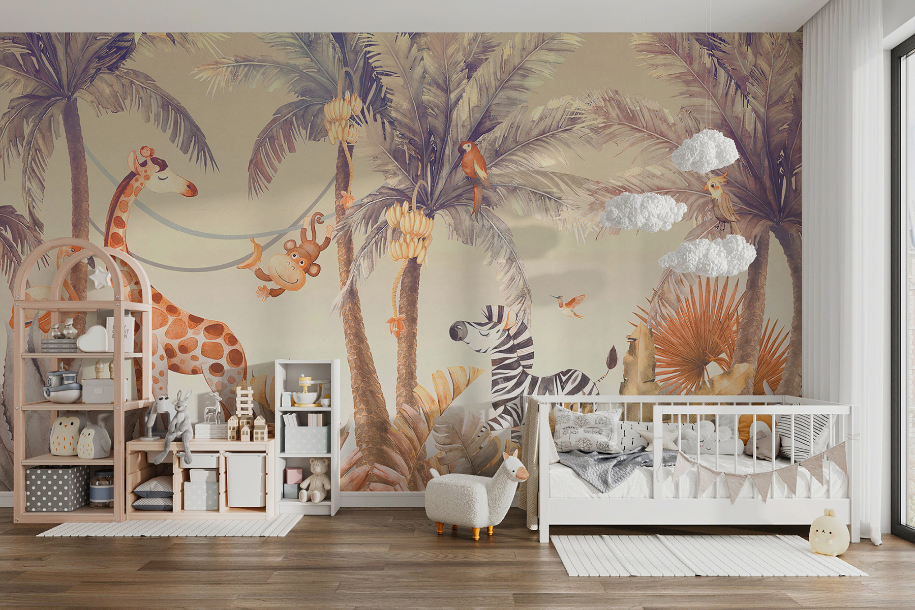 Imagínese entrar en una habitación y ser recibido por una fiesta en la selva. Este mural de pared, con un animado grupo de animales tomando el sol, lleva la sensación de aventura a su hogar. Un alegre mono se balancea en una acogedora hamaca junto a una simpática jirafa, mientras que una cebra y un flamenco se suman a la diversión. Es como si la jungla hubiera decidido celebrar una pequeña fiesta al sol, ¡y tú estás invitado! Este mural es perfecto para las habitaciones de los niños. Piensa en la chispa que brillará en sus ojos y en las imaginativas historias que se desarrollarán. Es más que una simple decoración: es un billete a una aventura lúdica cada día. Un toque de color, una pizca de fantasía y mucha alegría te esperan.