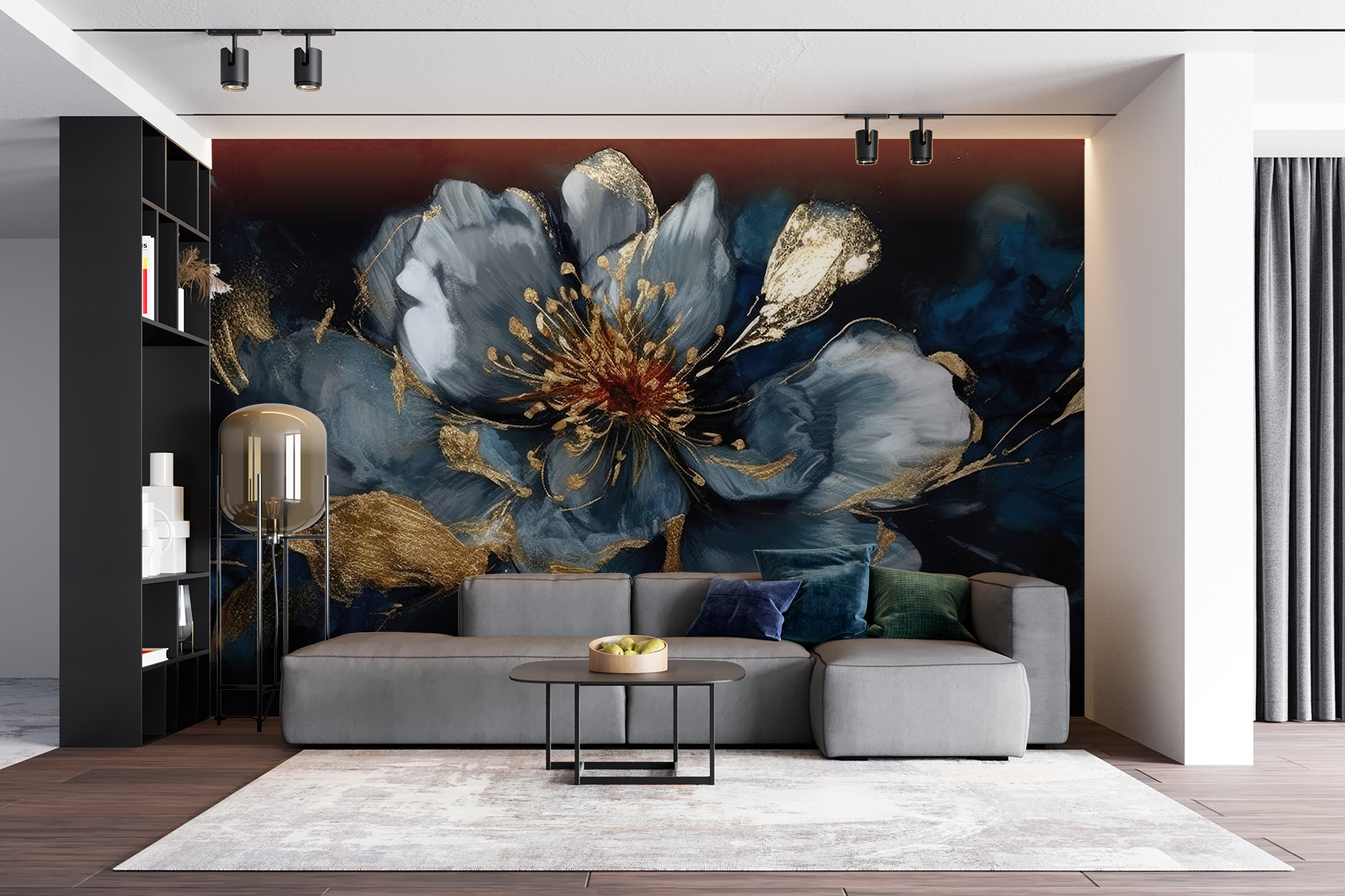 ¿Quiere añadir un toque de elegancia a su espacio? Echa un vistazo a este impresionante mural, “Elegante abstracto floral en tonos oscuros”. Tiene un aire hermoso y taciturno que es perfecto para dar a cualquier habitación un aire sofisticado y artístico. Imagínatelo detrás del sofá o de la cama: cada pétalo resalta, ¿verdad?
