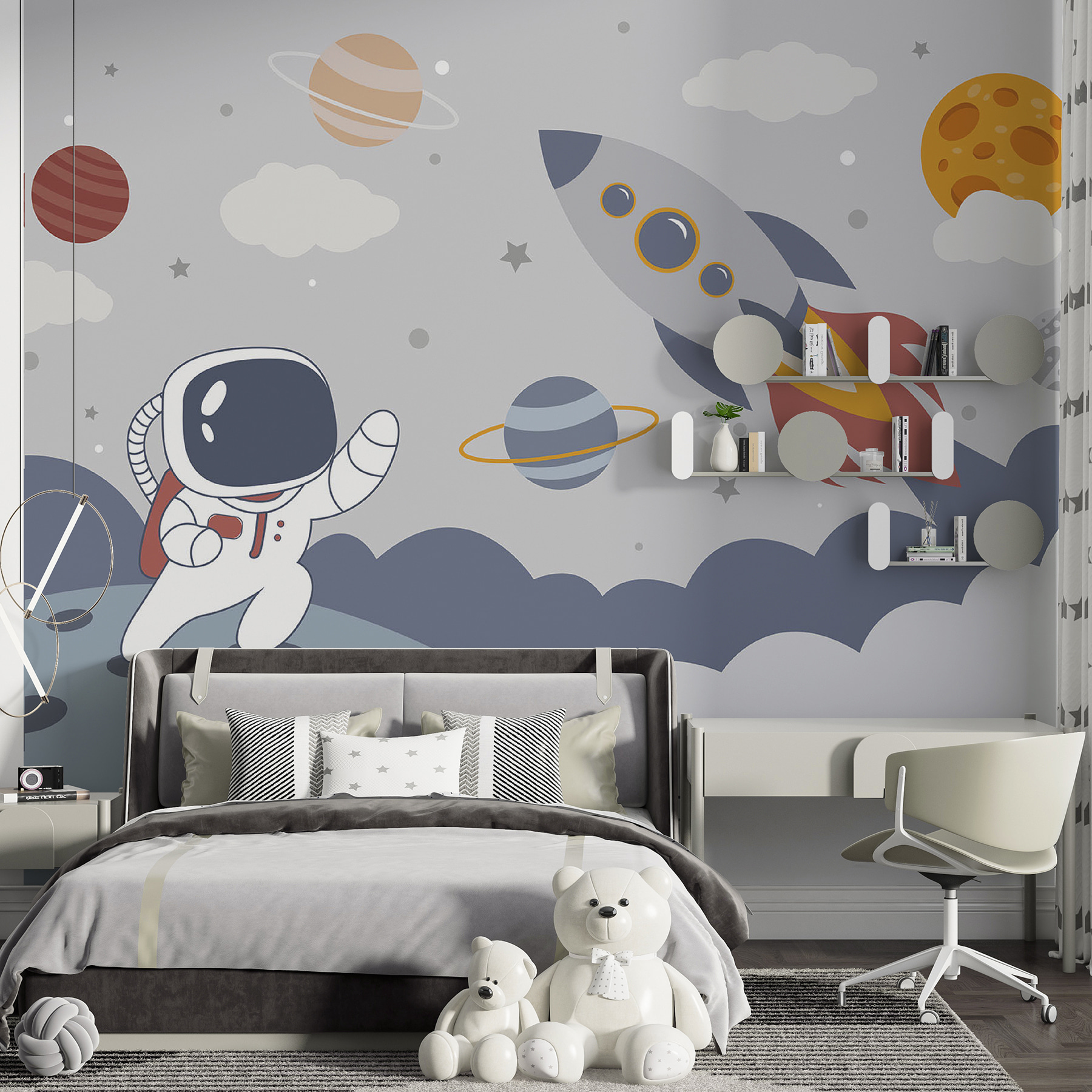 Transformar el espacio de un niño en una aventura cósmica es tan fácil como este mural con un encantador astronauta y vibrantes planetas. Imagina a tu hijo contemplando esta escena de otro mundo y soñando con viajes espaciales y aventuras intergalácticas. El divertido diseño aporta una dosis de imaginación, perfecta para despertar la curiosidad por el universo. Esos anillos de colores y esas nubes caprichosas invitan a soñar despiertos y a viajar a la hora de los cuentos, haciendo que la hora de dormir sea un poco menos ordinaria. No es sólo una decoración; ¡es una puerta a una galaxia de maravillas y alegría!