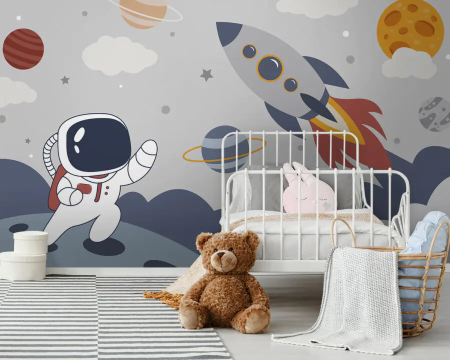 Transformar el espacio de un niño en una aventura cósmica es tan fácil como este mural con un encantador astronauta y vibrantes planetas. Imagina a tu hijo contemplando esta escena de otro mundo y soñando con viajes espaciales y aventuras intergalácticas. El divertido diseño aporta una dosis de imaginación, perfecta para despertar la curiosidad por el universo. Esos anillos de colores y esas nubes caprichosas invitan a soñar despiertos y a viajar a la hora de los cuentos, haciendo que la hora de dormir sea un poco menos ordinaria. No es sólo una decoración; ¡es una puerta a una galaxia de maravillas y alegría!