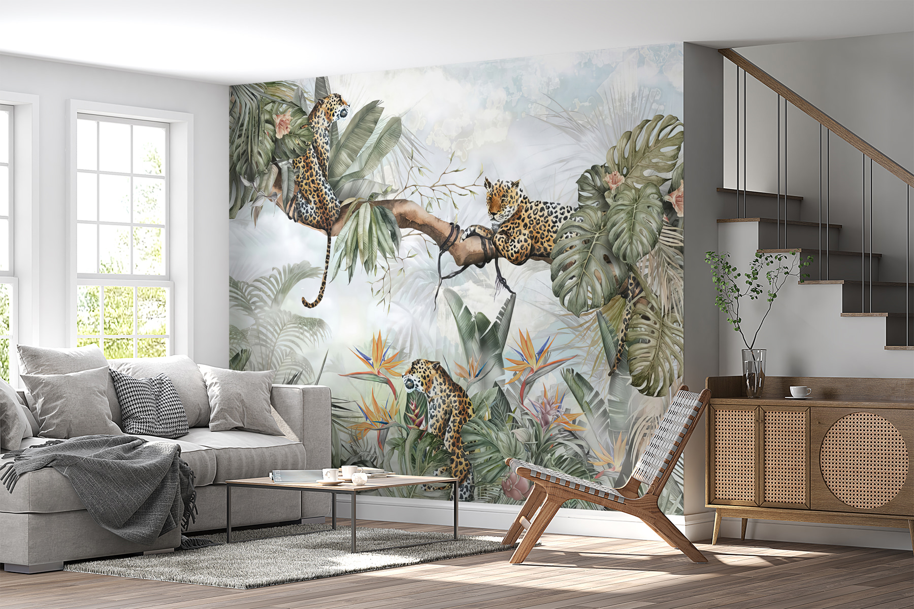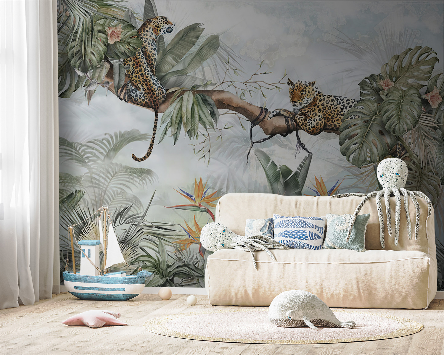 Transforma tu espacio con este encantador mural de avistamientos de leopardos en una exuberante selva. Imagina un rincón acogedor donde los niños puedan dar rienda suelta a su imaginación, ya sea con historias aventureras de exploradores de la selva o con tranquilas tardes acurrucados con un libro. Esos juguetones leopardos posados en los frondosos árboles despertarán la curiosidad y el asombro. La vibrante vegetación y las coloridas flores crean un alegre telón de fondo fresco y vivo. Es perfecto para añadir un toque de naturaleza al interior, convirtiendo cada mirada en una pequeña escapada. Así que respira ese ambiente selvático y ¡que empiece la diversión!