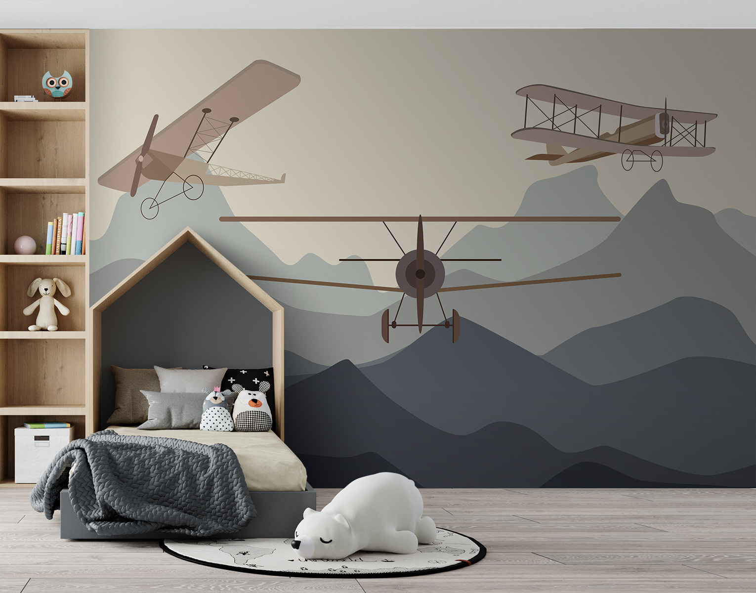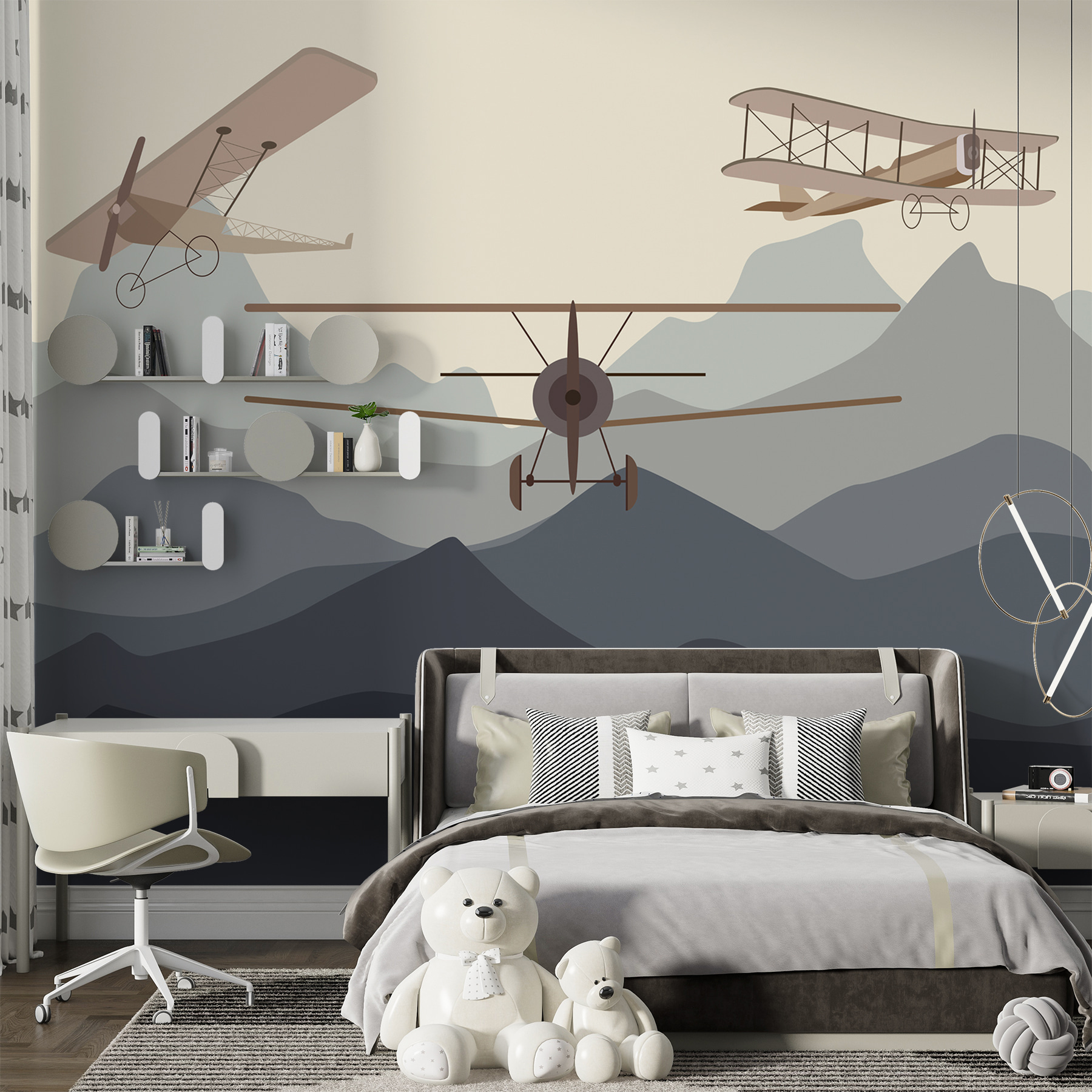Decore la habitación de su hijo con un toque de aventura con este mural de pared “Dos aviones volando en el aire”. Es perfecto para encender los sueños de escapadas de altos vuelos, desde la comodidad del hogar. Los biplanos de estilo retro surcando los cielos en tonos pastel sobre montañas onduladas aportan un aire caprichoso y atemporal. Imagina las historias que crearán tus pequeños, ¡volando en su imaginación! Este encantador mural encaja a la perfección en guarderías, salas de juegos o cualquier espacio que necesite un espíritu lúdico y aventurero. Así que prepárate para que los cuentos de antes de dormir levanten el vuelo con este encantador telón de fondo: no es sólo decoración, ¡es una plataforma de lanzamiento para los sueños!