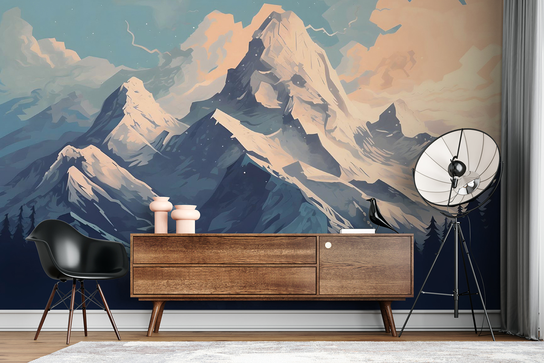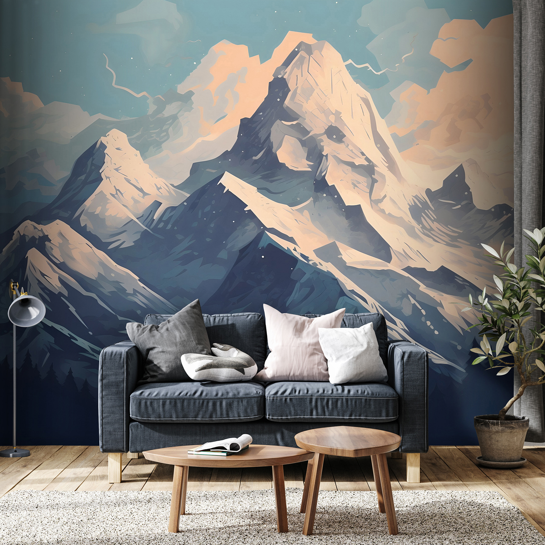 Imagina que entras en una acogedora cabaña, el olor a pino flota en el aire, y ahí está: el mural de imponentes montañas envueltas en mantos de nieve y nubes esponjosas. Esta pieza no es sólo un telón de fondo, es una invitación a soñar despierto con las crujientes mañanas alpinas y las aventuras que te esperan al otro lado de la puerta. Imagínate tomando un cacao caliente mientras el mundo exterior se cubre de blanco y lo único que ves son estos majestuosos picos. Perfecto para una sala de estar o un rincón de lectura, este mural trae el aire libre al interior, haciendo que cada mirada se sienta como una mini escapada. Perfecto para aquellos que anhelan un toque de la majestuosidad de la naturaleza sin la congelación.