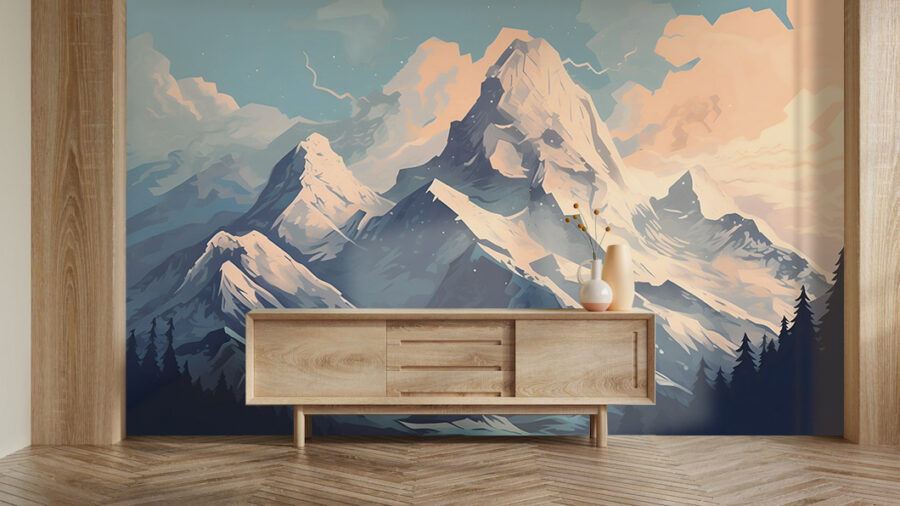 Imagina que entras en una acogedora cabaña, el olor a pino flota en el aire, y ahí está: el mural de imponentes montañas envueltas en mantos de nieve y nubes esponjosas. Esta pieza no es sólo un telón de fondo, es una invitación a soñar despierto con las crujientes mañanas alpinas y las aventuras que te esperan al otro lado de la puerta. Imagínate tomando un cacao caliente mientras el mundo exterior se cubre de blanco y lo único que ves son estos majestuosos picos. Perfecto para una sala de estar o un rincón de lectura, este mural trae el aire libre al interior, haciendo que cada mirada se sienta como una mini escapada. Perfecto para aquellos que anhelan un toque de la majestuosidad de la naturaleza sin la congelación.