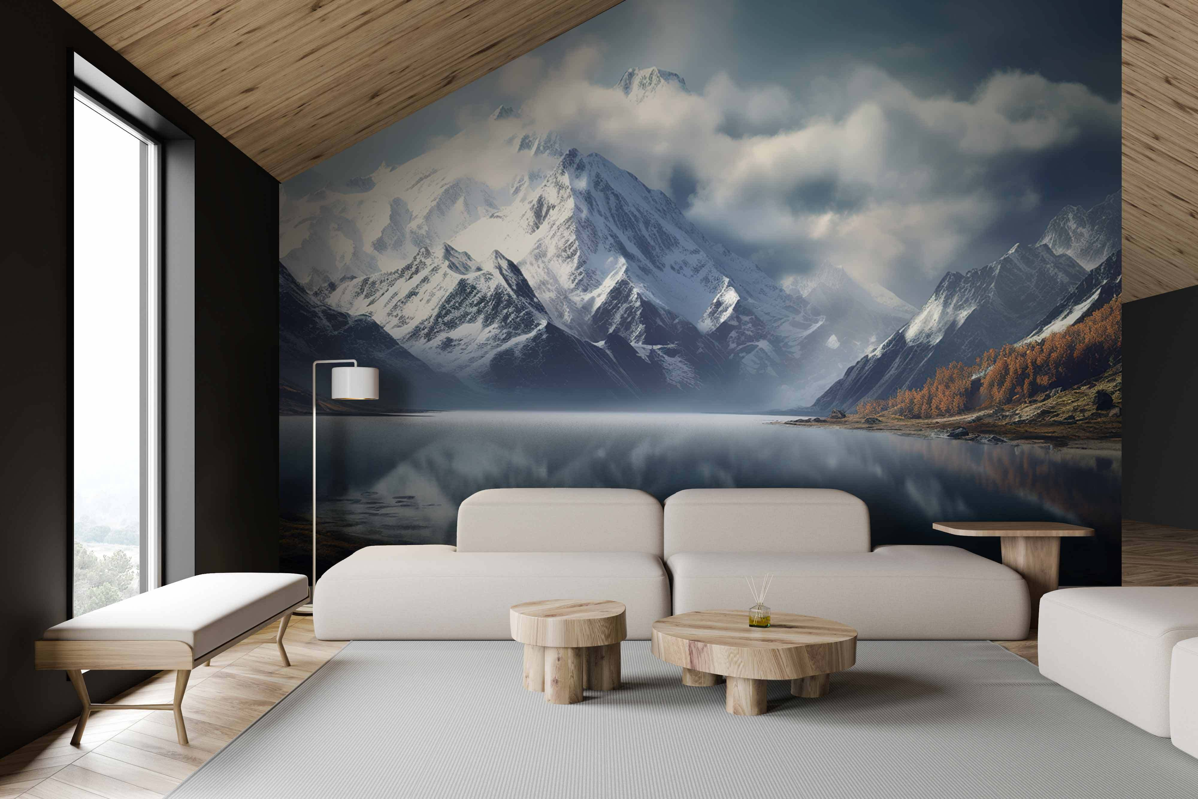 Imagínese recostado en el sofá, con una taza de algo caliente en la mano, y perdiéndose en la serena escena de picos lejanos y aguas reflectantes. Es casi como unas minivacaciones sin hacer la maleta ni quemarse por el sol. Además, el naranja otoñal de los árboles aporta el toque justo de calidez.