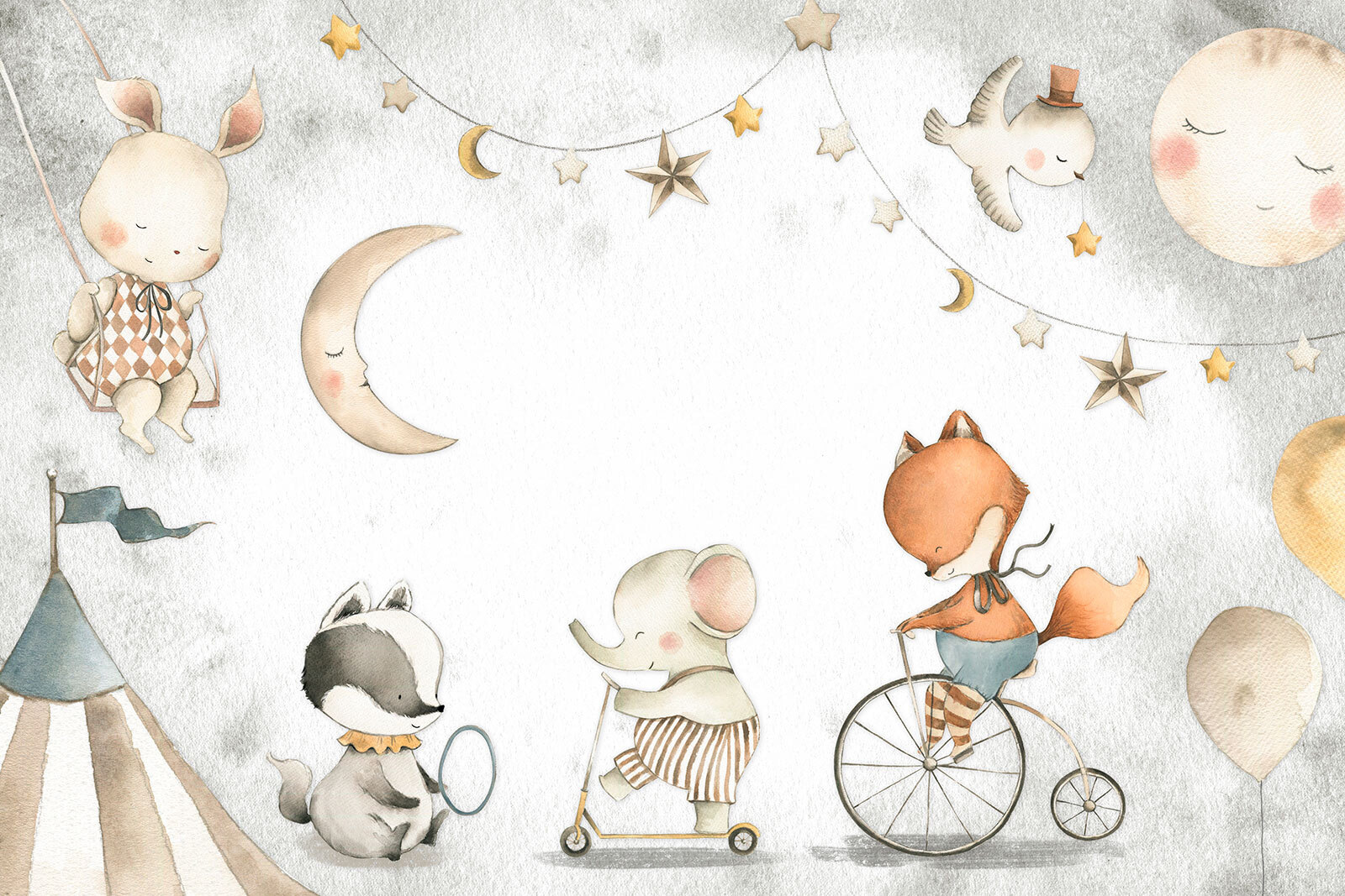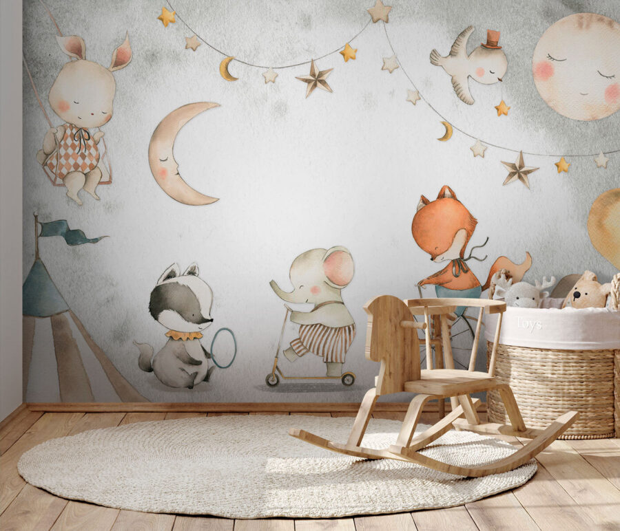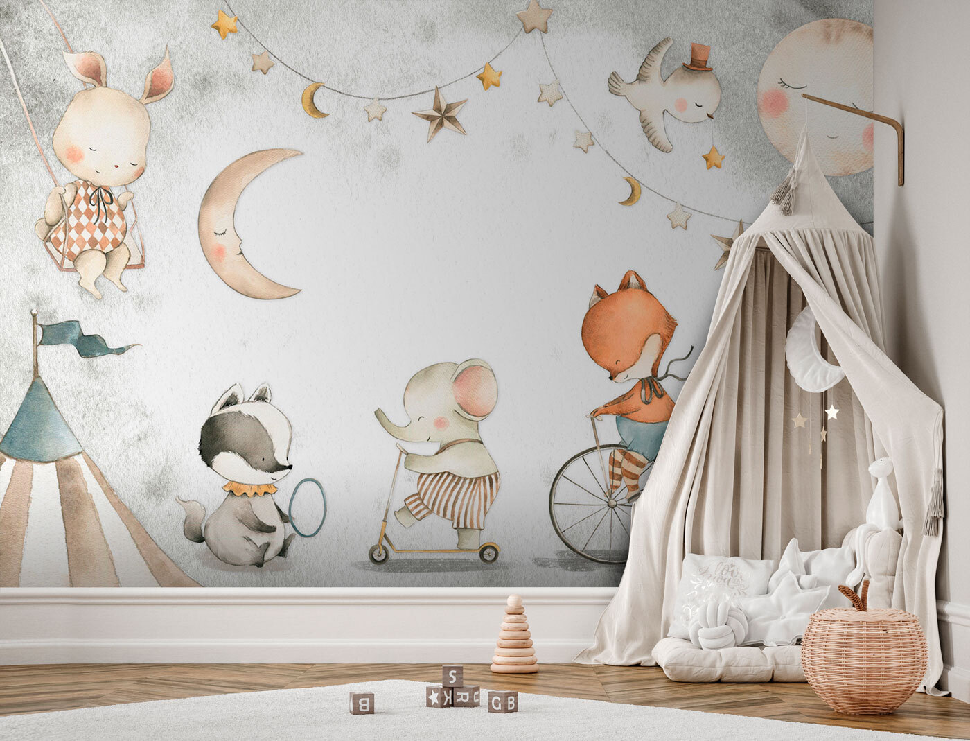 Transforma la habitación de tu hijo en un caprichoso país de las maravillas con el mural de pared “Animales juguetones en el carnaval del circo”. Este encantador estampado te transporta a un acogedor carnaval de ensueño, donde encantadores animales juegan y retozan bajo un cielo estrellado. Perfecto para añadir un toque de magia a los dormitorios o zonas de juego, presenta un dulce conejito, un zorro juguetón y otros adorables amigos que se divierten en varias atracciones de carnaval. Te encantará ver cómo se ilumina la cara de tu pequeño cuando descubra las encantadoras escenas. No es sólo decoración de pared; es una dosis diaria de alegría. Imagínese cuentos para dormir con este telón de fondo: ¡pura magia!