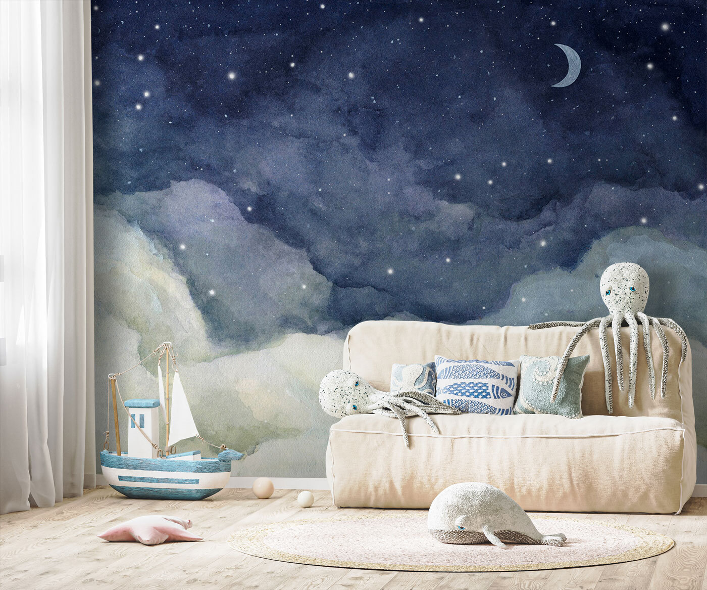 Transforma cualquier pared en una escapada de ensueño con este encantador mural de nubes y estrellas. Imagina un cielo sereno, donde los más pequeños puedan sumergirse en sus propias aventuras, contemplando las nubes suaves y esponjosas y las estrellas centelleantes. Es como tener un trozo del cielo nocturno en tu habitación. Perfecto para un espacio infantil, este mural añade un toque caprichoso que despierta la imaginación. Tanto si se trata de cuentos antes de dormir, de meriendas a medianoche o de soñar despierto, este mural crea una atmósfera acogedora. Convierte esas paredes en un lienzo de maravillas, donde cada mirada invita a una nueva historia. ¡Qué manera tan fantástica de inspirar la creatividad y el amor por el cielo nocturno!