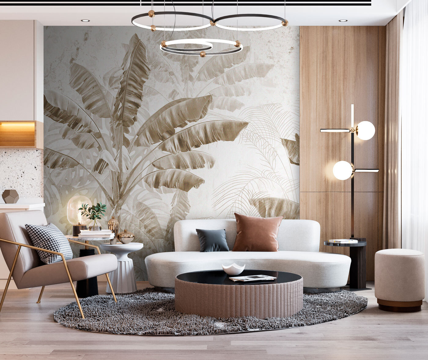 Imagina tu salón envuelto en el ambiente sereno y terrenal de los “Murales de pared Hojas tropicales en tono sepia”. Es como entrar en un exuberante paraíso sin salir de casa. Los suaves tonos sepia le dan un aire tranquilo y acogedor, como un pequeño oasis. Perfecto para relajarse con una taza de té o simplemente perderse en un buen libro. El detalle es increíble: casi puedes sentir la textura de las hojas bajo tus dedos.
