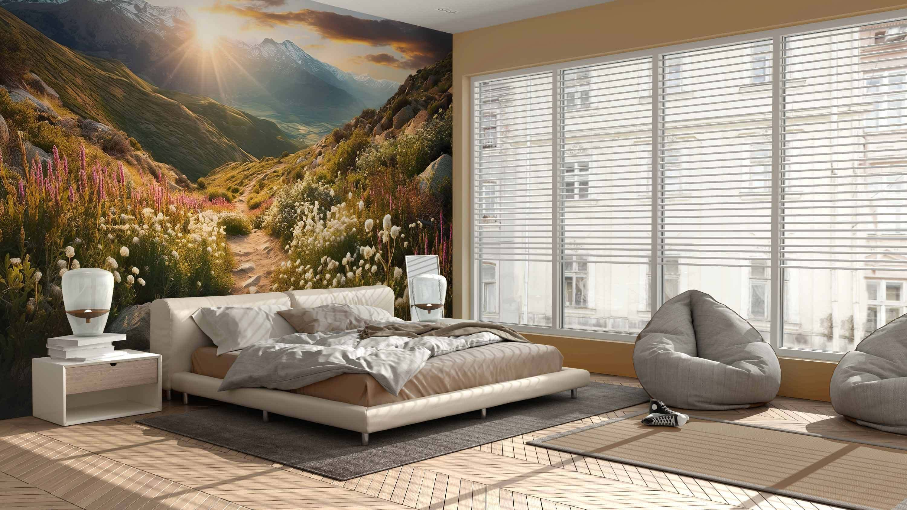 Transforma un espacio monótono en un refugio de ensueño con los “Murales de pared Puesta de sol sobre sendero de flores de montaña”. Imagine adentrarse en un mundo sereno donde las vibrantes flores silvestres bailan con la brisa y las majestuosas montañas se extienden sin fin. Este mural le invita a respirar profundamente, sentir la calidez de una puesta de sol y abrazar la tranquilidad de la naturaleza en su propia casa.