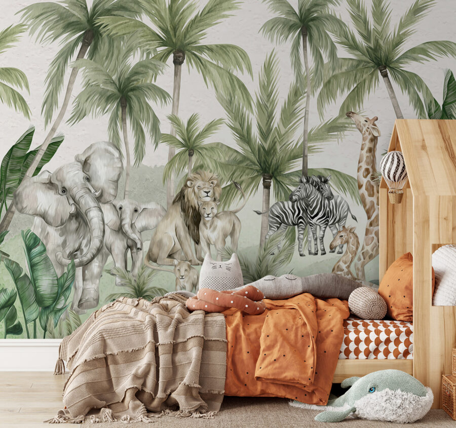 Transforma la habitación de tu hijo en una mágica aventura en la selva con los “Murales de pared Animales de la selva bajo las palmeras”. Es como entrar en un libro de cuentos, con simpáticos elefantes, juguetonas cebras y majestuosos leones bajo palmeras que se mecen. Perfecto para bebés, hijos o hijas, este mural aporta un ambiente tranquilo pero emocionante a cualquier habitación infantil o cuarto de juegos. Imagina los cuentos que puedes contar antes de dormir con este fondo. A los niños les encanta ver las altas jirafas que se asoman por encima de la exuberante vegetación. Es encantador, atractivo y maravillosamente salvaje, un favorito instantáneo para los pequeños exploradores.