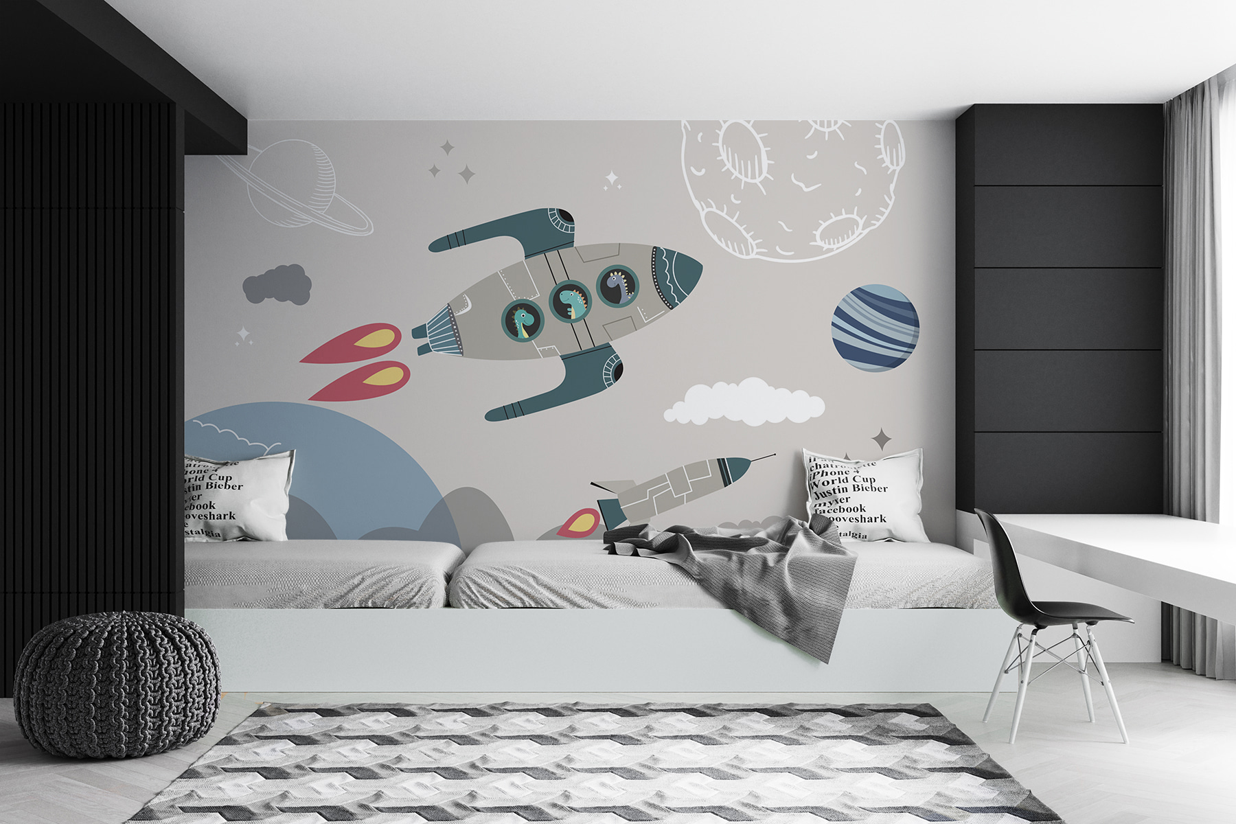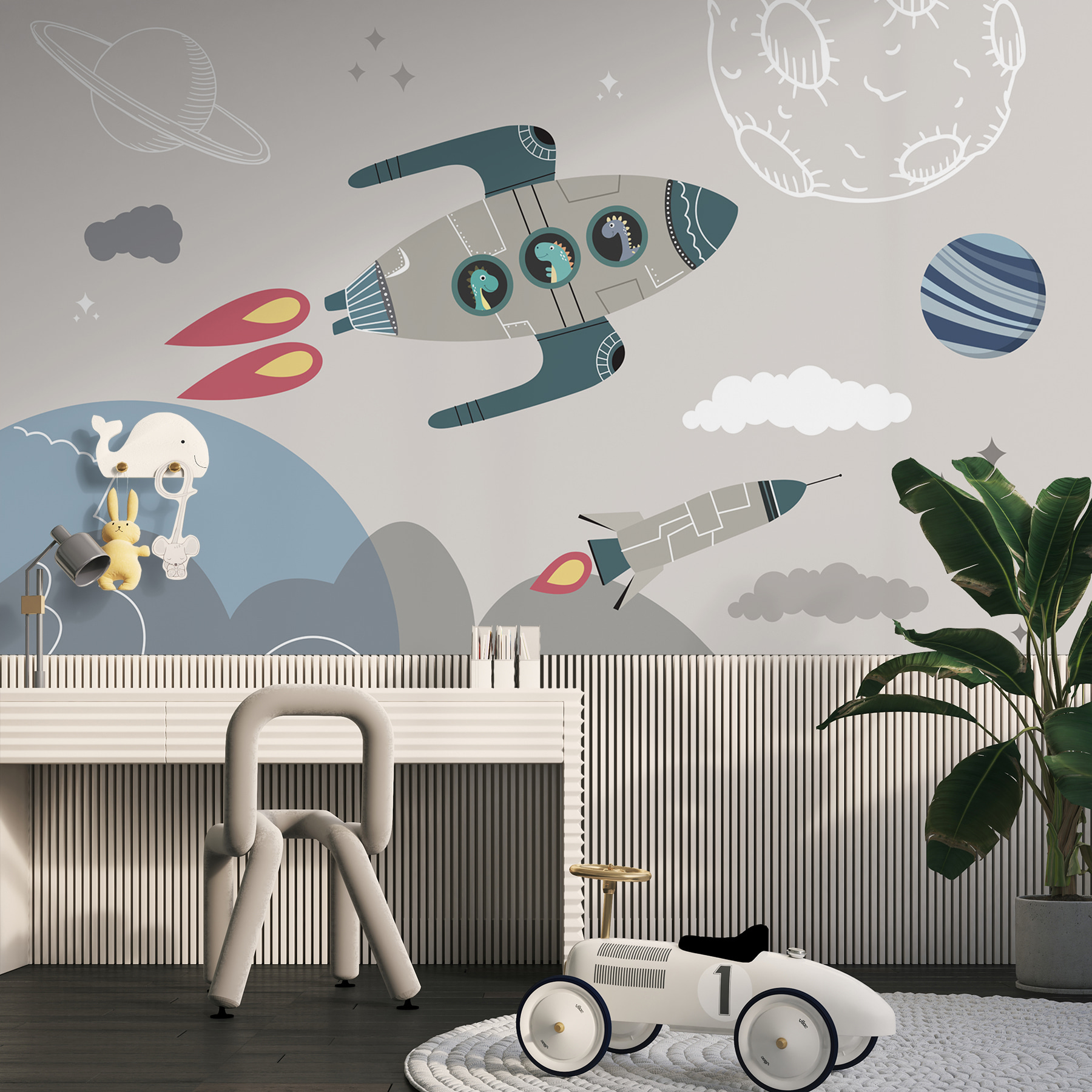 Imagínatelo: dinosaurios surcando el espacio en cohetes espaciales. ¡Es pura magia en una pared! Perfecto para la habitación de cualquier niño, este mural despierta un sinfín de aventuras y una imaginación desbordante. Piensa en cuentos para dormir sobre astronautas T-Rex y alunizajes de dinosaurios. Ver cómo se iluminan los ojos de tu pequeño cada vez que lo ve no tiene precio. Los colores son suaves y atractivos, creando un ambiente acogedor y estimulante a la vez. Es una caprichosa mezcla de encanto prehistórico y frescura de la era espacial. Ideal para pequeños soñadores y futuros exploradores. ¿Hora de dormir con cohetes? Sí, ¡por favor!