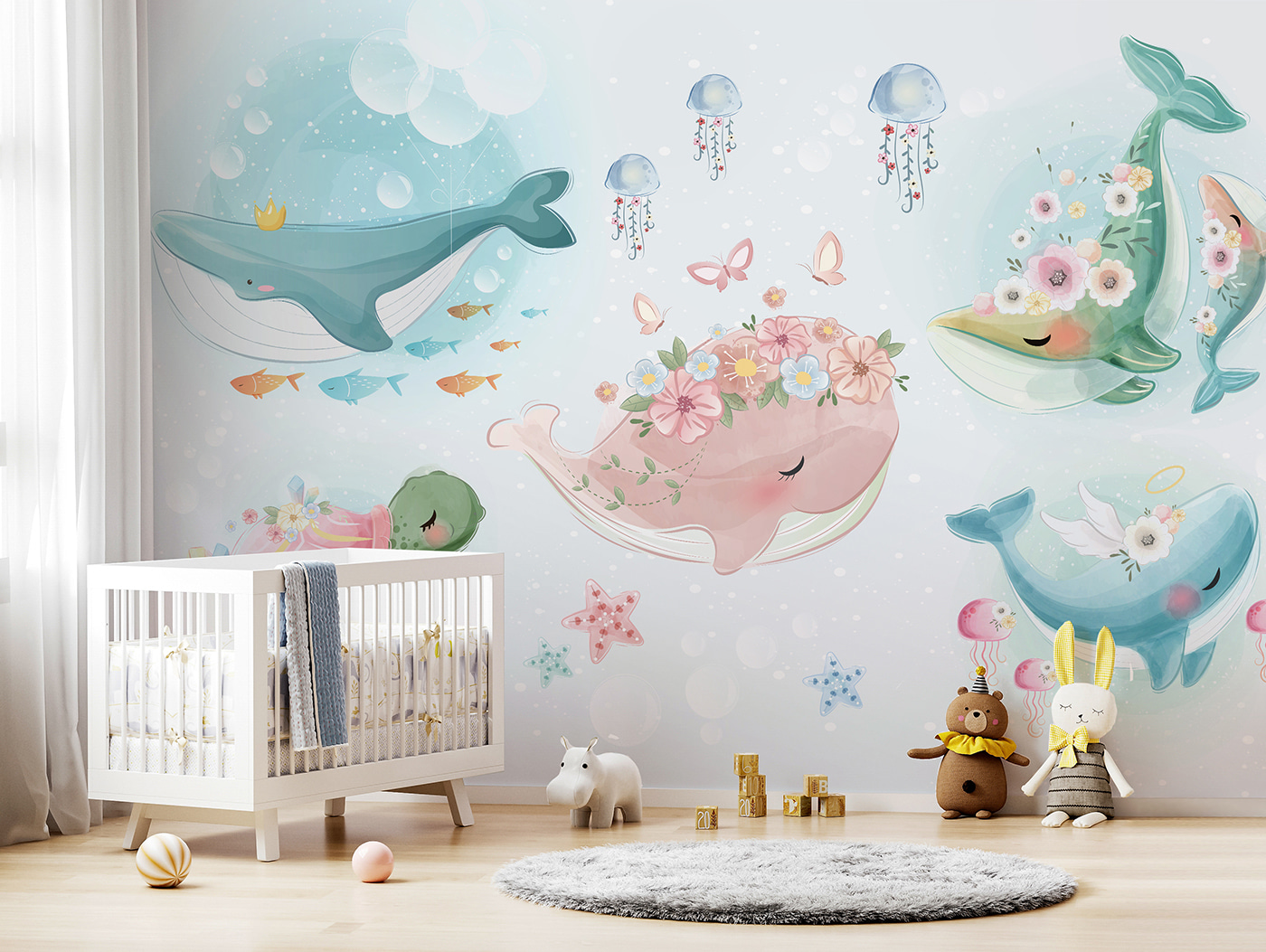 Imagina añadir un toque de fantasía a la habitación de tu pequeño con el mural “Ballena rosa con flores en la cabeza”. ¿Se lo imagina? Este encantador mural muestra una adorable ballena de color rosado coronada con delicadas flores, flotando entre un mar de encantadores amigos marinos: medusas, tortugas y mucho más. Es perfecto para despertar dulces sueños y aventuras oceánicas.