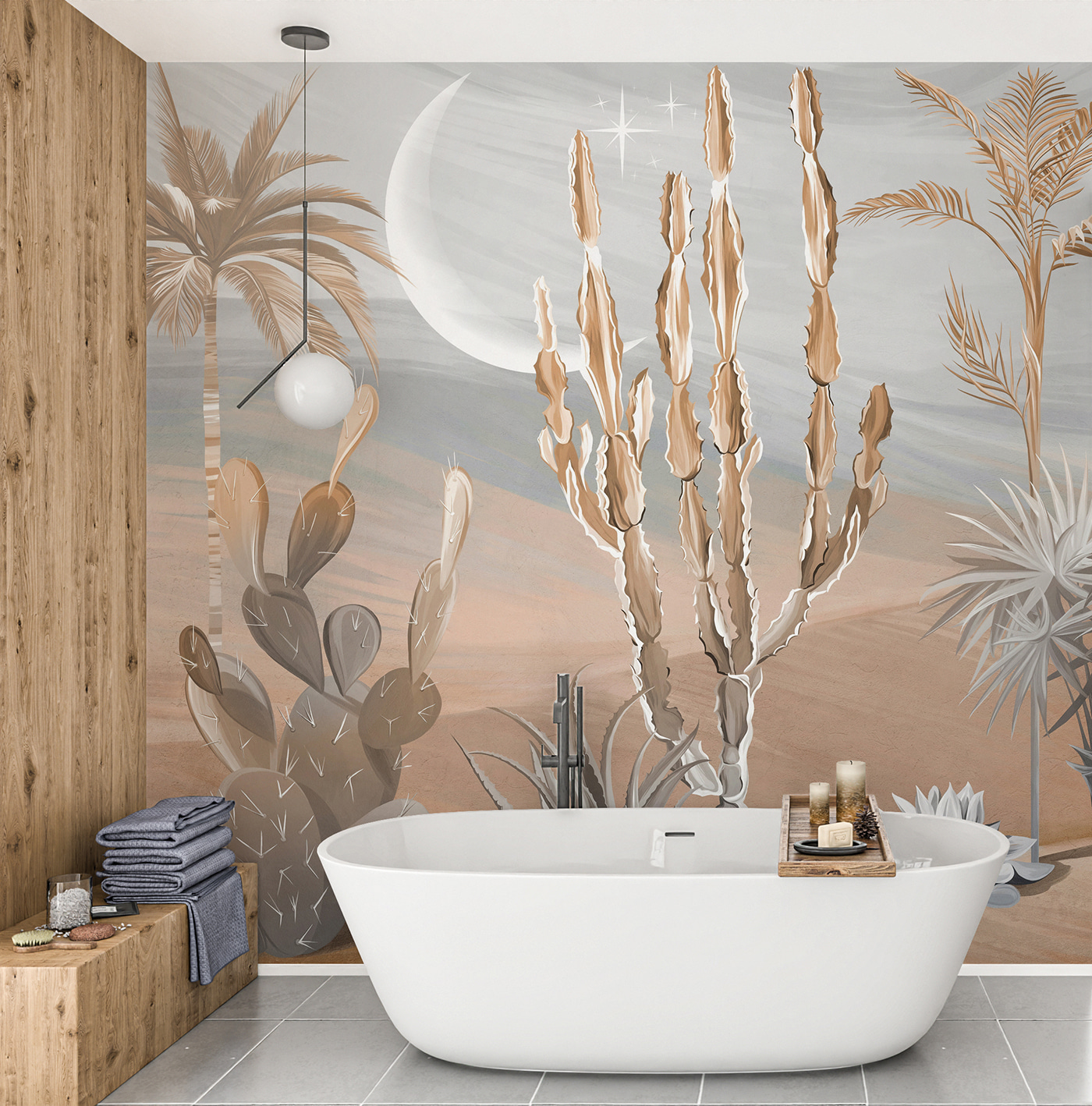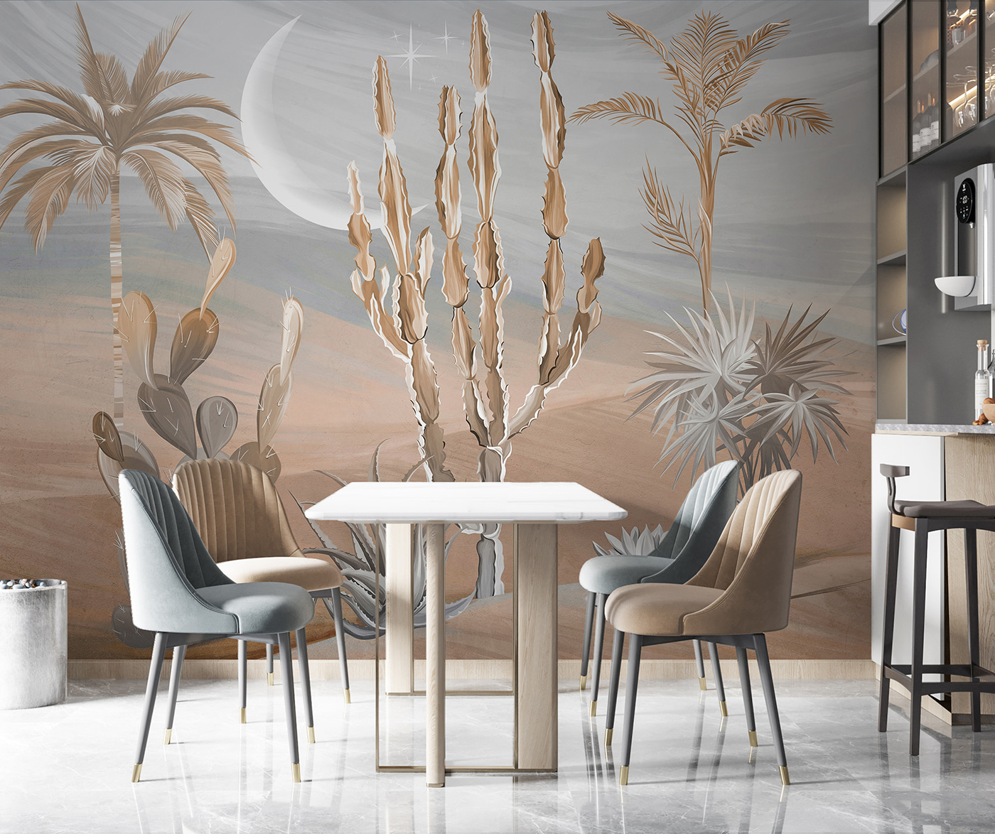 Echa un vistazo a este genial mural. Imagina llevarte un trozo del desierto al salón de tu casa: cactus, palmeras y ese paisaje de ensueño. Es como entrar en un oasis sereno sin el calor abrasador ni las plantas espinosas. Perfecto para añadir un toque de nostalgia a cualquier espacio.