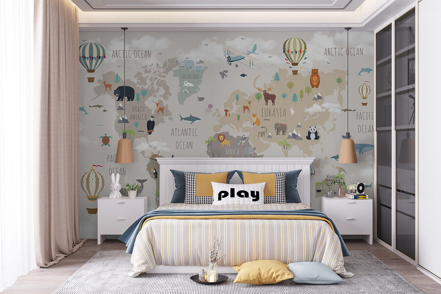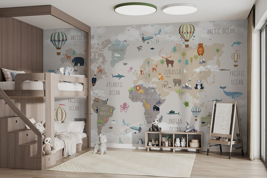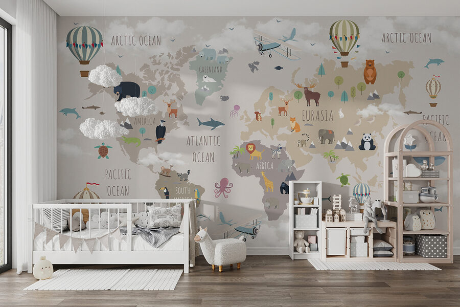 Este mural no es sólo decoración, es toda una experiencia. Los niños pueden aprender sobre los diferentes continentes y océanos mientras ven a sus animales favoritos, desde osos polares en Groenlandia hasta canguros en Australia. Los colores apagados son tranquilizadores, perfectos para los cuentos antes de dormir o las tardes de domingo. Es el tipo de decoración que despierta la imaginación y la curiosidad, por lo que es ideal para guarderías, salas de juegos o incluso aulas. Además, descubrir nuevos detalles cada día mantiene viva la magia.